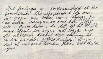 Innhold i brevet over: "Det forelanges av forrmannskapet at det sinnsvake Rekvisjonskontoret ikje maa faa nogen mer makt aaver nybygg for da kann rekvisjonskontoret bare bygge selv. og da kaamer der slett ikje til at bli noget bygget, for ingen vill bygge vist det sinnsvake kontoret skall bestemme det. er her fremdeles gestapo kontor i Bergen? Det er nett som Himler Hitler selv skulde rejert."
