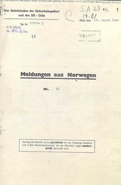 Tyskerne i Norge holdt sine overordnede i Tyskland løpende orientert om begivenhetene her. Disse hemmelige Meldungen aus Norwegen er en sentral kilde om tysk etterretning i Norge. A-2848.002/Y/0003/01