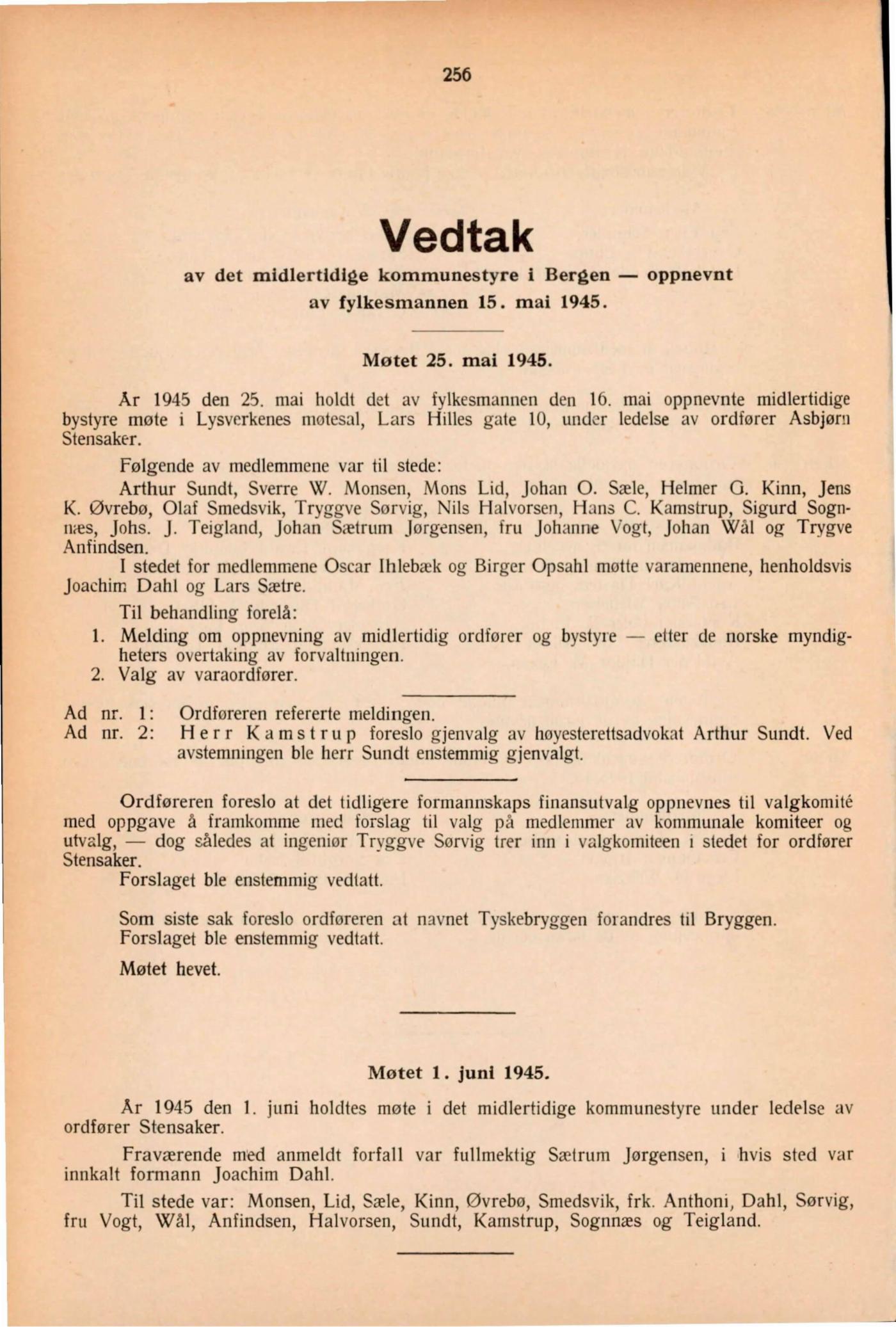 Saken ble foreslått av ordføreren i møtet. Det er derfor ikke en innstilling til saken, og den er ikke søkbar. Du finner møtereferatet her: Vedtak av det midlertidige kommunestyret 25. mai 1945.