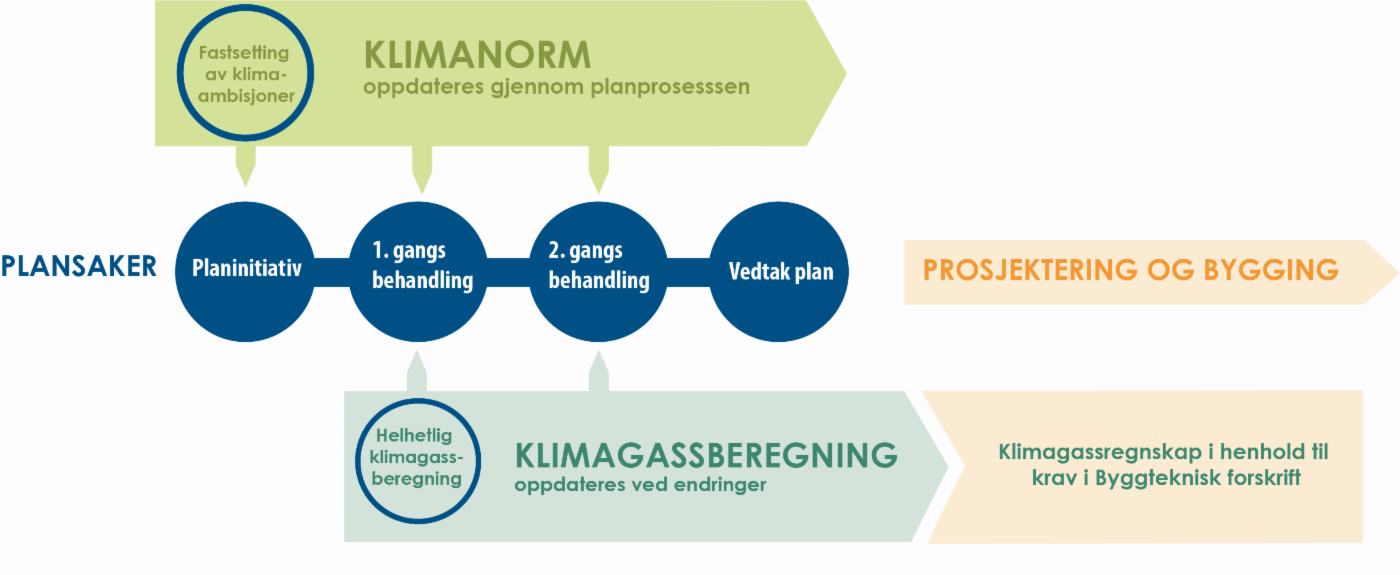 I menyen til venstre finner du informasjon om klimagassberegninger og klimanorm. Figuren under viser når de ulike verktøyene skal brukes for å gjennomføre klimavurderinger. Både utbyggere, planleggere og saksbehandlere har nytte av disse verktøyene.