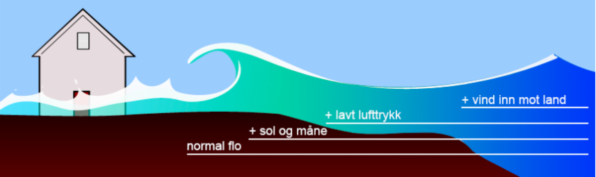 Enkelt sagt blir det stormflo når både lavt lufttrykk og vind i kombinasjon med tidevannet, presser vannet inn mot kysten. Dermed blir vannstanden høyere enn ved vanlig høyvann, og vi får oversvømmelser.