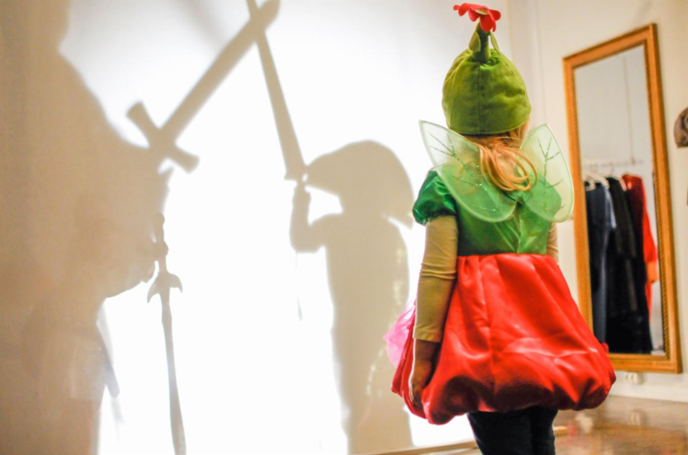 Fortellingens lek. Vakre stoffer, hatter, kostymer og skjulte skatter står klar til bruk på Barnas kulturhus. Her kan en kle seg ut og leke seg inn i fortellingen og fantasiens verden.