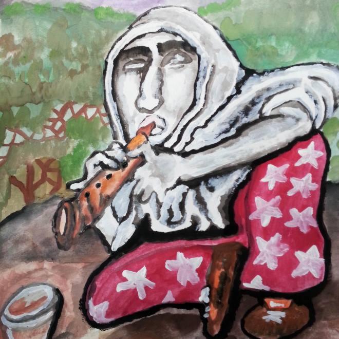 Maleri av en person med rød bukse med stjerner på, grå hette på hodet og som spiller fløyte