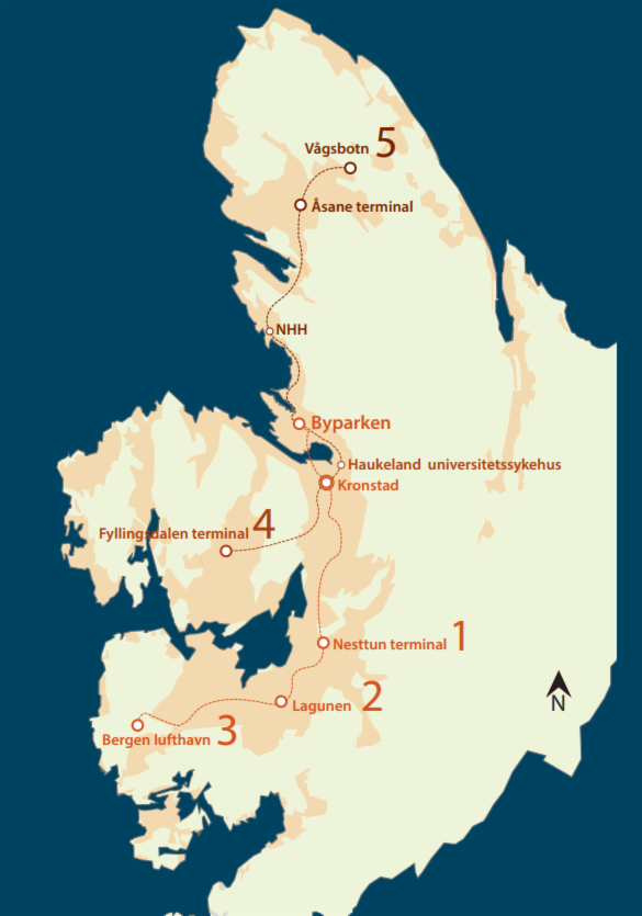 - Femte byggetrinn mellom sentrum (Kaigaten) og Åsane (Vågsbotn) ble vedtatt av Bergen bystyre 31. mai og 27. september 2023.