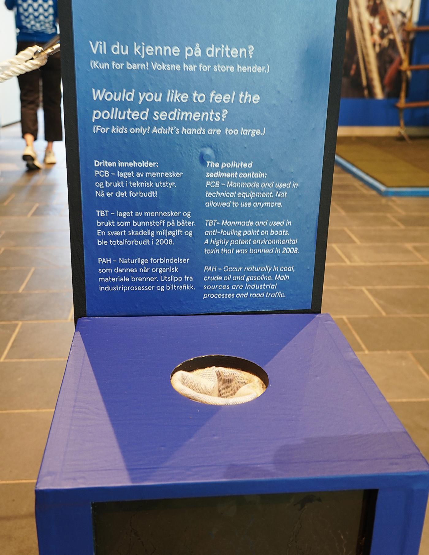 Plansjer med tekst og bilder fra arbeidet med å sjaine Byfjorden pryder også veggene, sammen med en slags boks som barn kan stikke hånden nedi for å “kjenne på” den forurensede sjøbunnen, som vi nå har pakket inn i ny og ren sjøbunn.