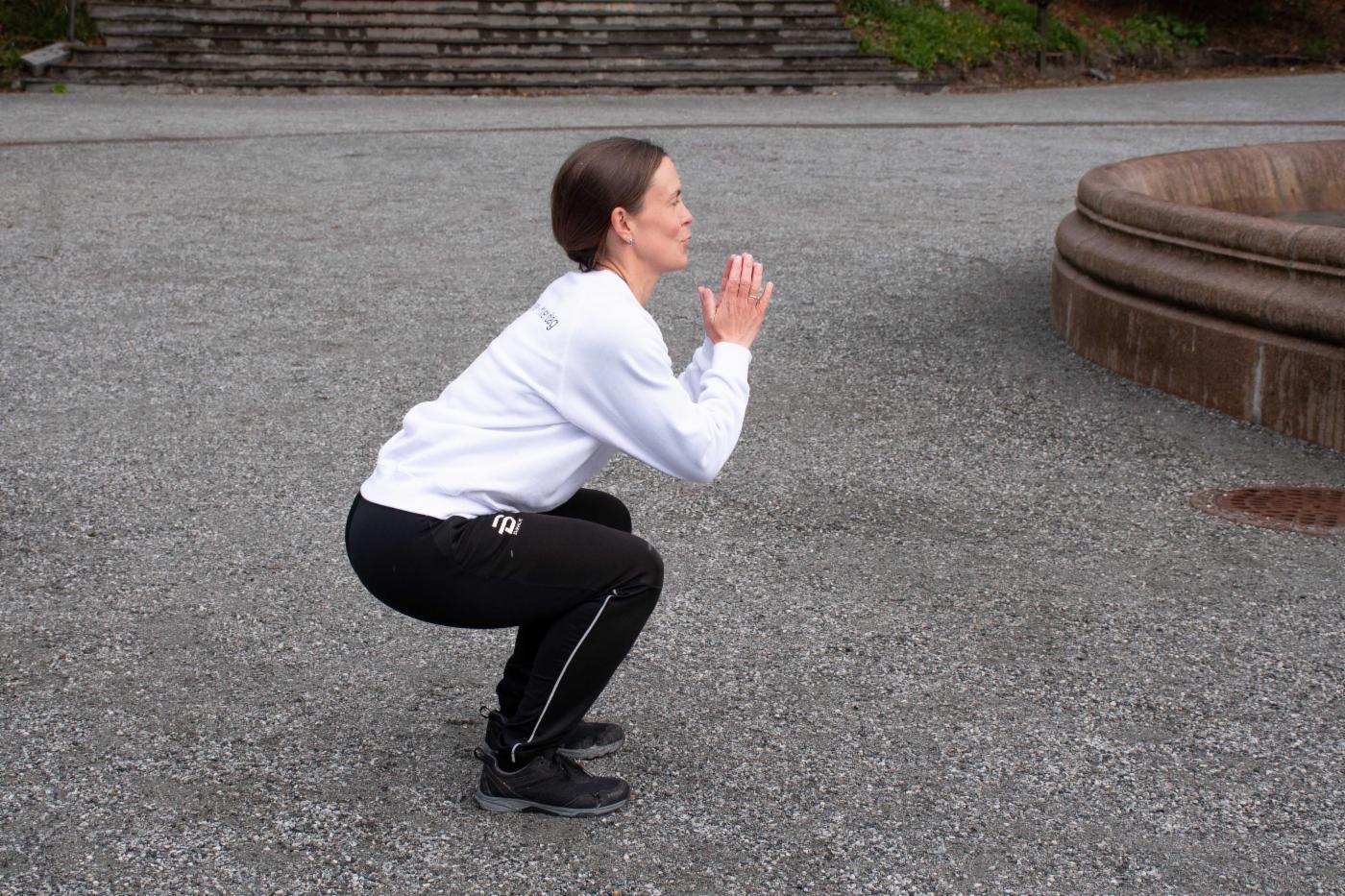 Tenk at du skal sette deg ned på en stol, og bøy deg ned så langt du klarer. Hold hodet og blikket rett frem.