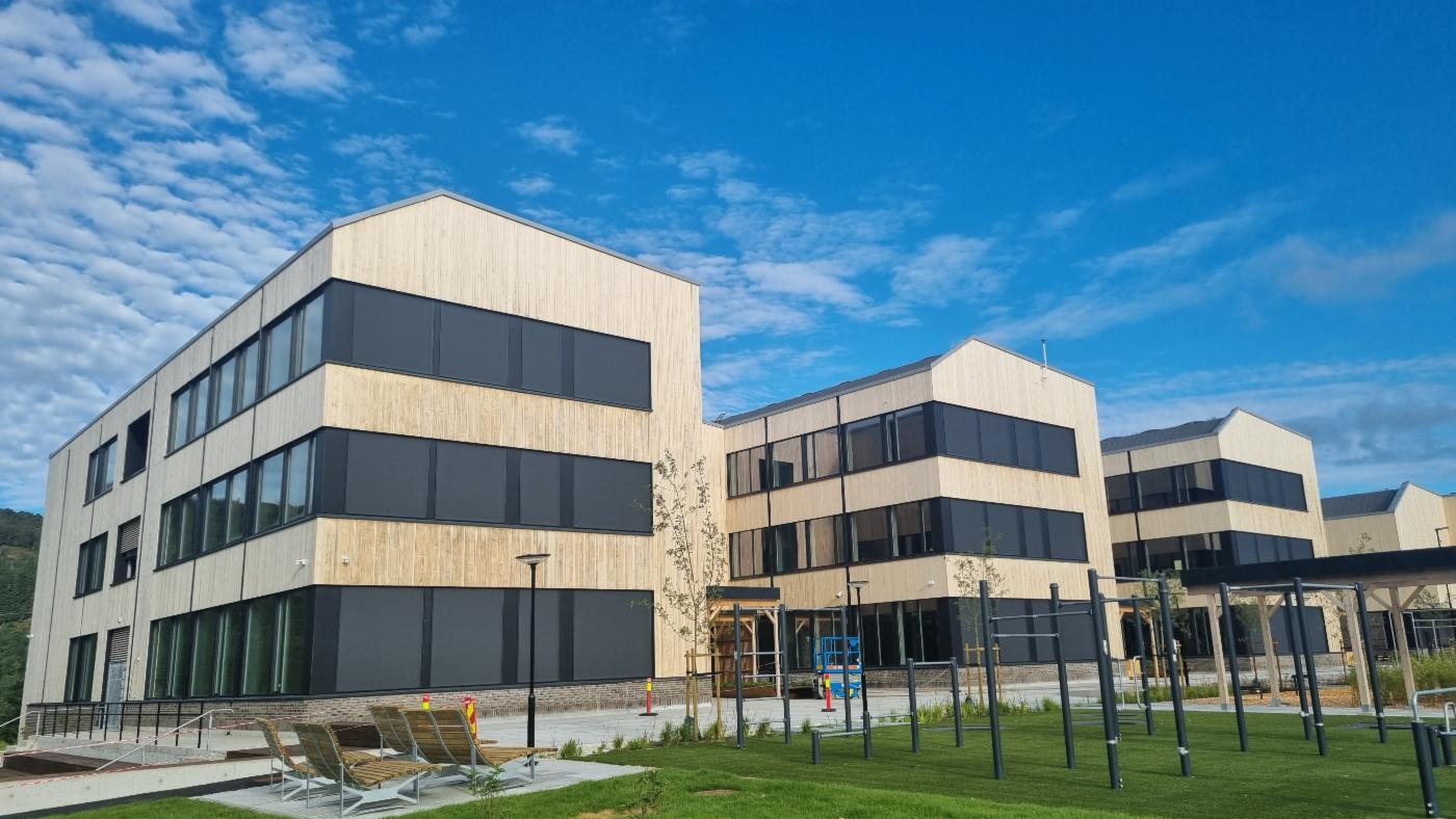 Nybygget er i hovudsak utført i massivtre, med unntak av underetasje og heissjakter i betong. Nybygget har om lag det same fotavtrykket som den forrige skulen, men vil vere ein etasje høgare.