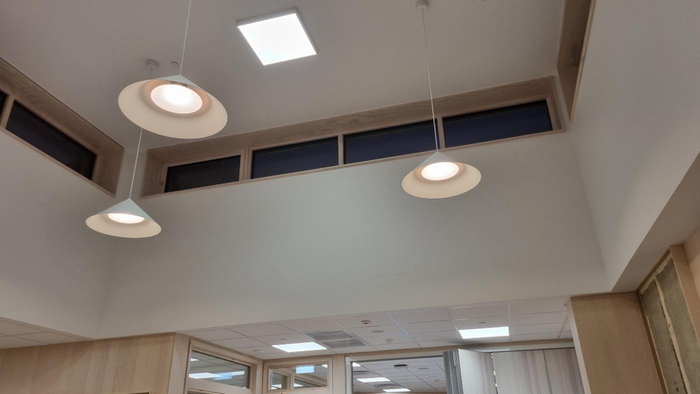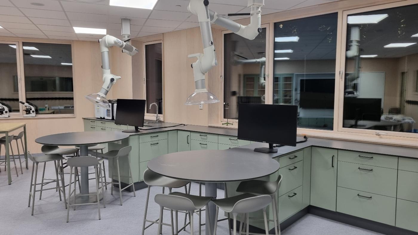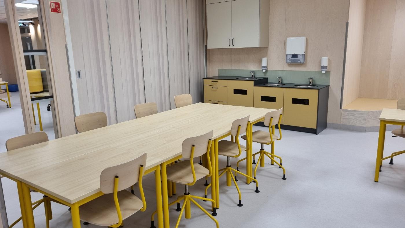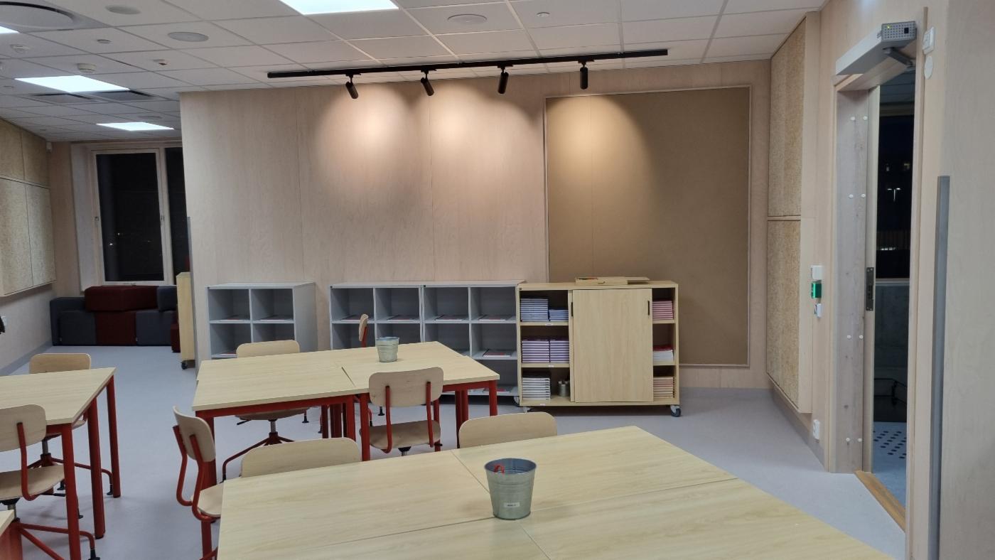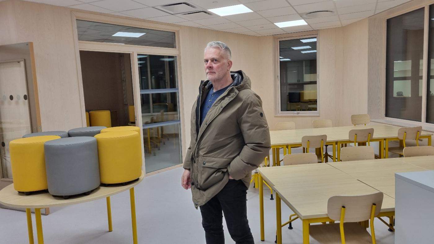 – I tilbygget er det musikkrom og forskerrom. Det er ellers vanlige hjemmeområder for de eldste elevene. Det nye bygget har vi bundet sammen med det gamle med en innebygd gangbro. Her har vi også plassert kunsten i prosjektet, forteller Mortensen.