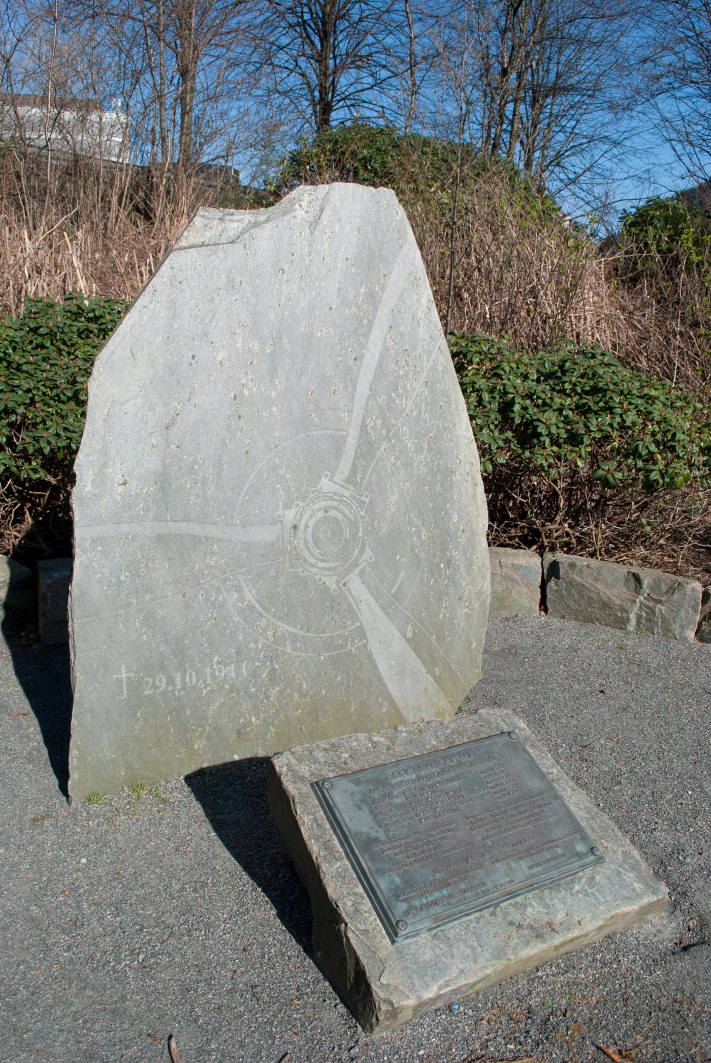 Mellom Florida og Brannstasjonen langs vannet er det laget en gressplen ved siden av stien. Her står et steinrelieff laget av Vossaskifer med innriss av en propell og noe av propellbladene; "Lancastermonumentet" laget av John Audun Hauge. Hele lengden på bladene er ikke med da propellen er avbildet i naturlig størrelse. Videre er det risset inn et kors og datoer 29.10.1944. Foran ligger en stein med navn og inskripsjon. Dette er et minnesmerke over 6 besetningsmedlemmer som omkom da bombeflyet, en Lancaster fra Royal Australian Air Force, ble skutt ned av tysk luftvernild og styrtet omtrent her i 1944.