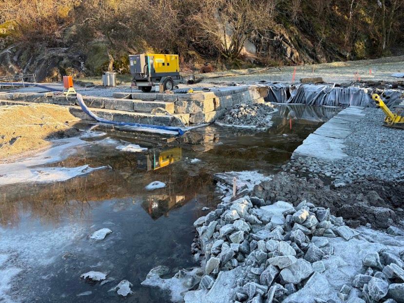 - Det meste av ny sjøfront med amfi av naturstein er etablert.