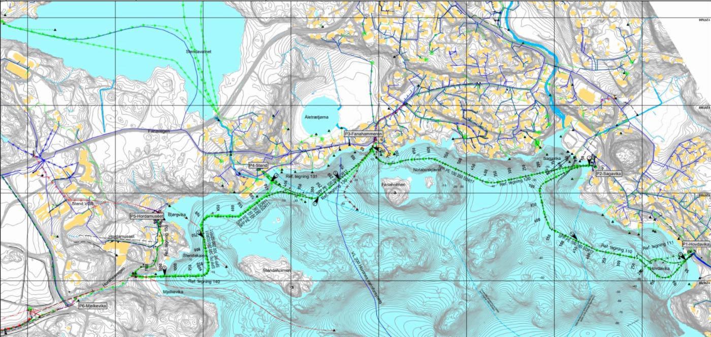Fanahammeren avløpssanering omfatter etablering av nytt avskjærende spillvannssystem, fra de enkelte utslippspunktene i indre del av Fanafjorden, til eksisterende spillvannssystem ved Hordnesvegen (se skisse).