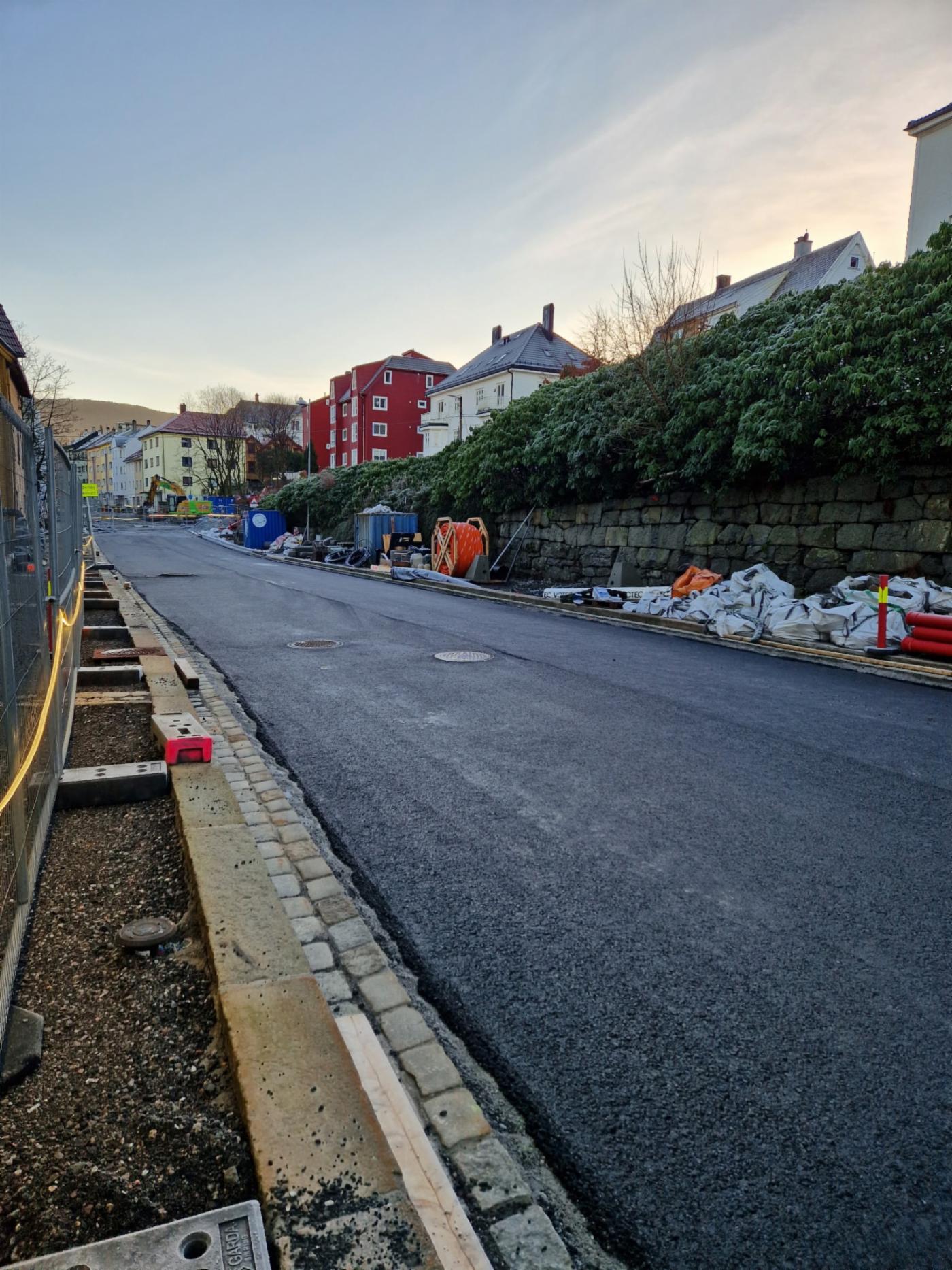 Arbeidene nord i Michael Krohns gate nærmer seg sluttfasen, og før jul ble det første bærelaget asfaltert. På grunn av frosten må videre asfaltering avventes noe.