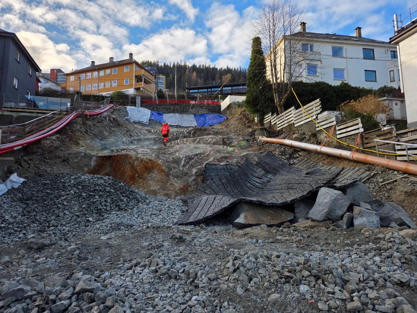 I parken mellom Lien og Bøhmersgate pågår det sprengningsarbeid. Nye ledninger skal legges også her, før parken blir oppgradert.