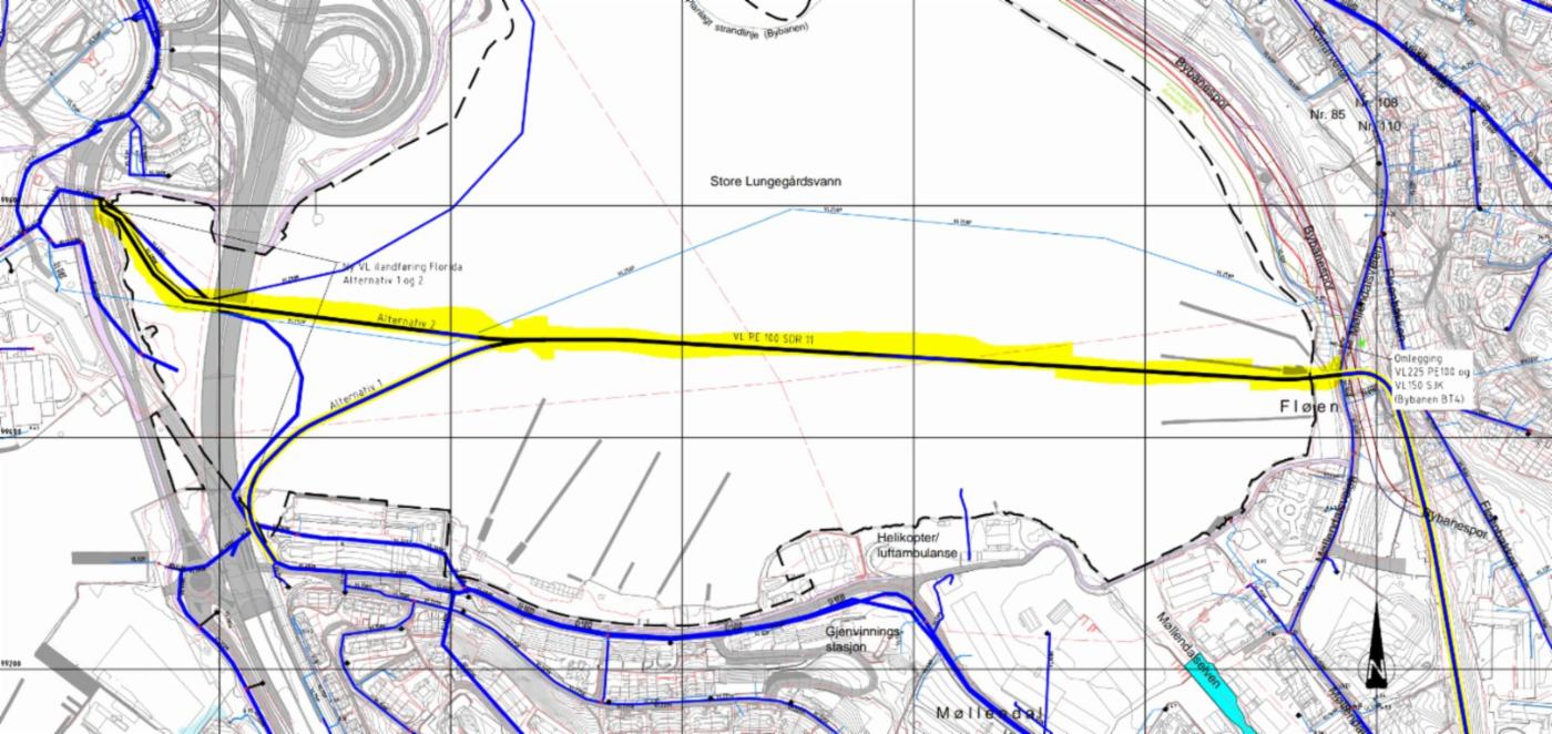 Vi er nå i gang med etablering av en ny sjøledning i Store Lungegårdsvann som skal erstatte den eksisterende ledningen i Møllendalsveien. Denne ledningen vil gå mellom Fløen og Florida. En strekning på om lag 1100 meter.