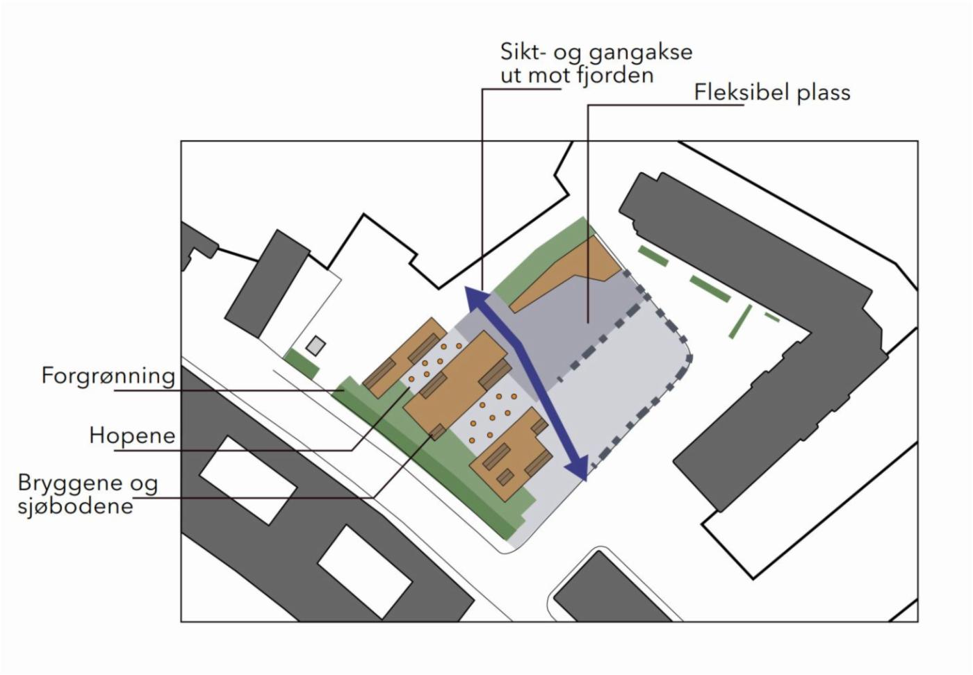 Viktige siktlinjer fra Tollboden og byfjorden er ivaretatt i et åpent og fleksibelt rom. Her er det gitt plass til arealkrevende aktiviteter som gatesport og sykkellek, og til større arrangementer.