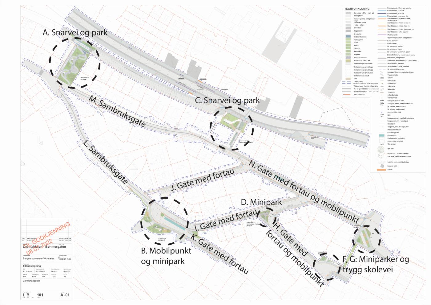 Vi oppgraderer disse gatene, snarveiene og grøntområdene (markert i kartet).