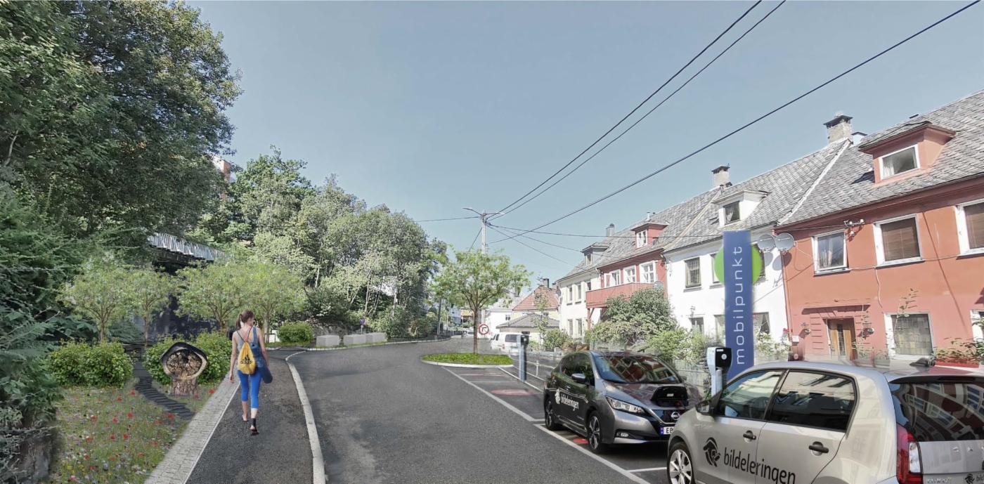 Slik kommer det til å se ut i Søndre Skogveien, etter at Bymiljøetaten har rustet opp gaten og fått mobilpunkt.