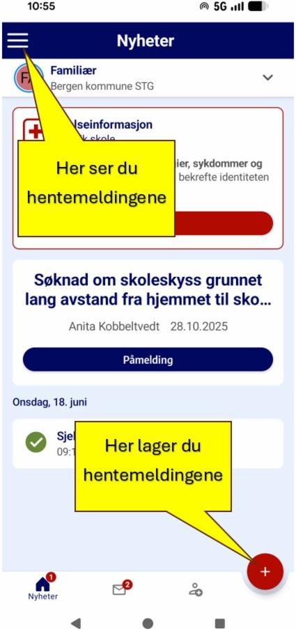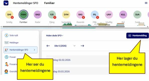 Du kan bruke hentemelding for å gi beskjed om når barnet ditt skal hentes fra SFO, eller når barnet skal gå hjem selv. Du kan skrive inn hentemelding for enkeltdager eller repeterende hentemeldinger som gjelder for flere dager.