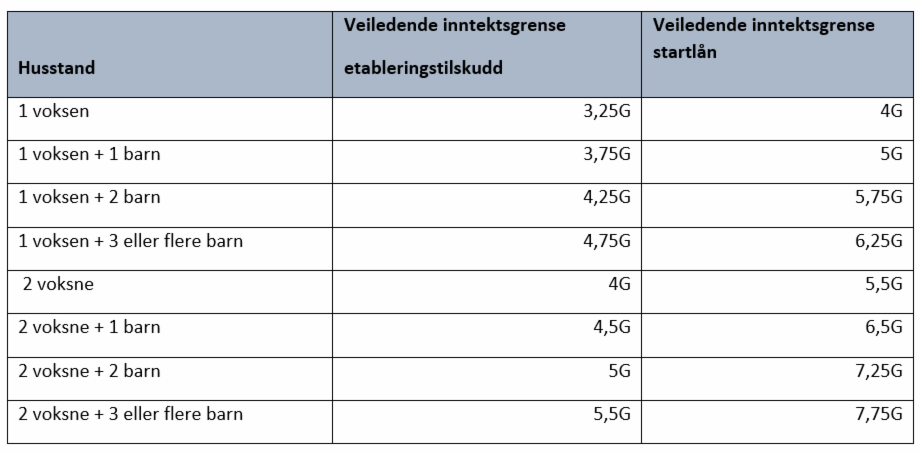 Bergen kommunes veiledende inntektsgrenser for startlån og tilskudd.