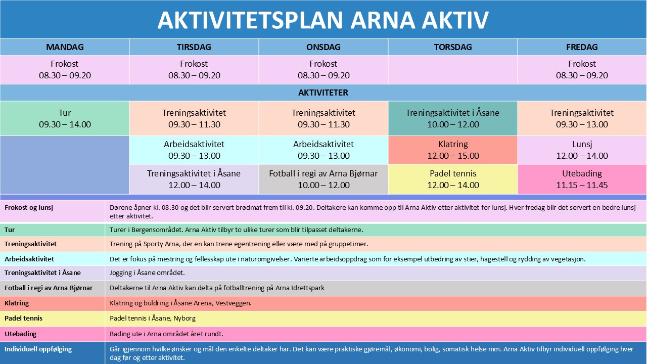 Arna Aktiv er et rehabiliteringstilbud for personer med rusutfordringer i Bergen kommune. Gjennom fysisk aktivitet og et trygt fellesskap fremmer vi helse, mestring og livsglede. Målet er å hjelpe deltakerne videre mot deltakelse i samfunnet – enten gjennom arbeid, skole eller frivillig arbeid.