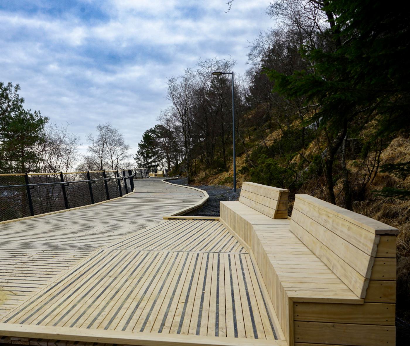 Det er bygget seks rasteplasser langs gangbroen. Her kan nistepakken nytes med nydelig utsikt til Bergensdalen