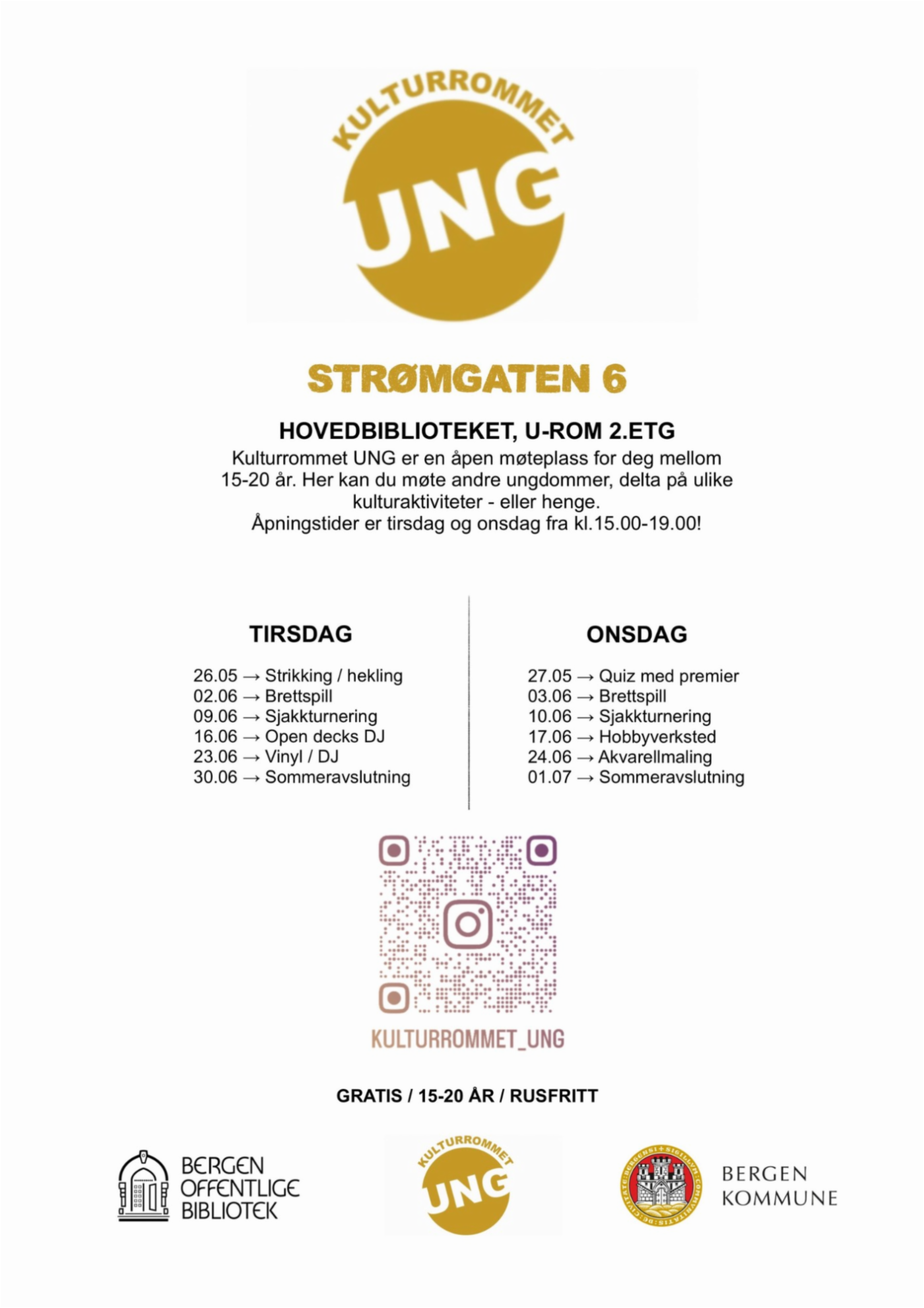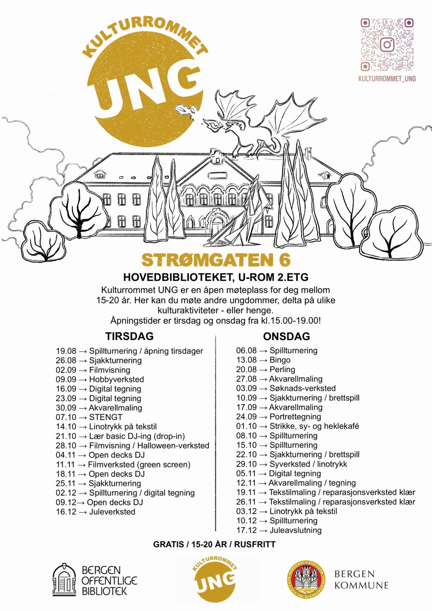 Kulturrommet Ung er en åpen møteplass i regi av Etat for bibliotek og kultur for ungdom fra 9. trinn til 20 år. På Kulturrommet Ung er det mulig å delta på ulike kulturaktiviteter. Velkommen!