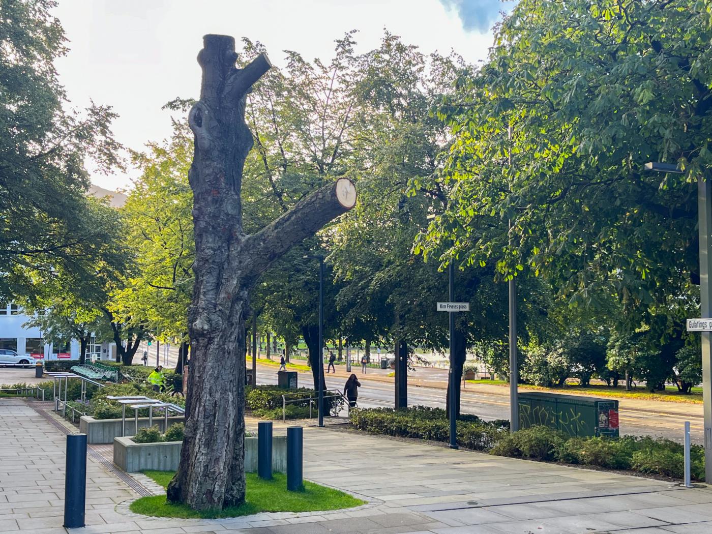 På Rådhusplassen har Bergen kommune valgt å la stammen av en gammel hestekastanje bli stående. Dette er et bevisst valg for å støtte det biologiske mangfoldet i sentrum, og for å vise hvordan naturen kan få plass – også i byrommet.