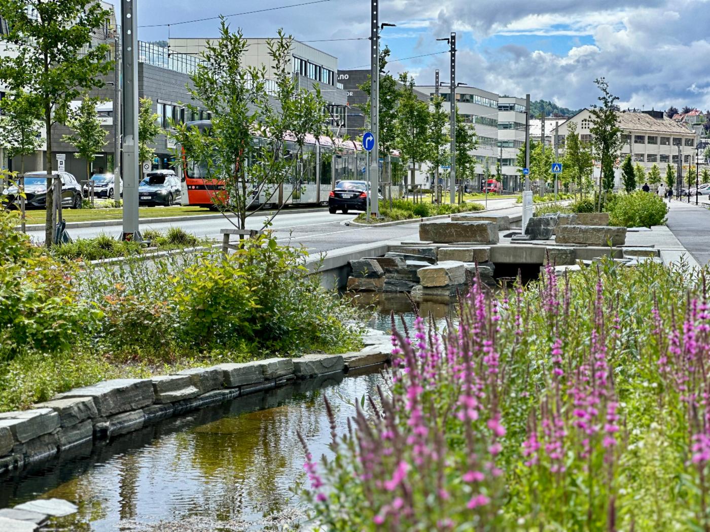Ved å etablere både regnbed og små bekkeløp hjelper til med å lede og drenere vannet