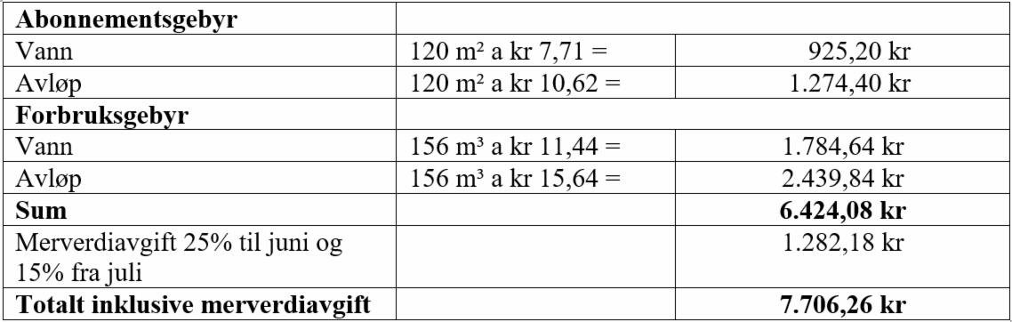 Fra 1. juli 2025 ble merverdiavgiften (mva) for vann og avløp redusert fra 25 % til 15 % (ref. merverdiavgiftsloven §5).