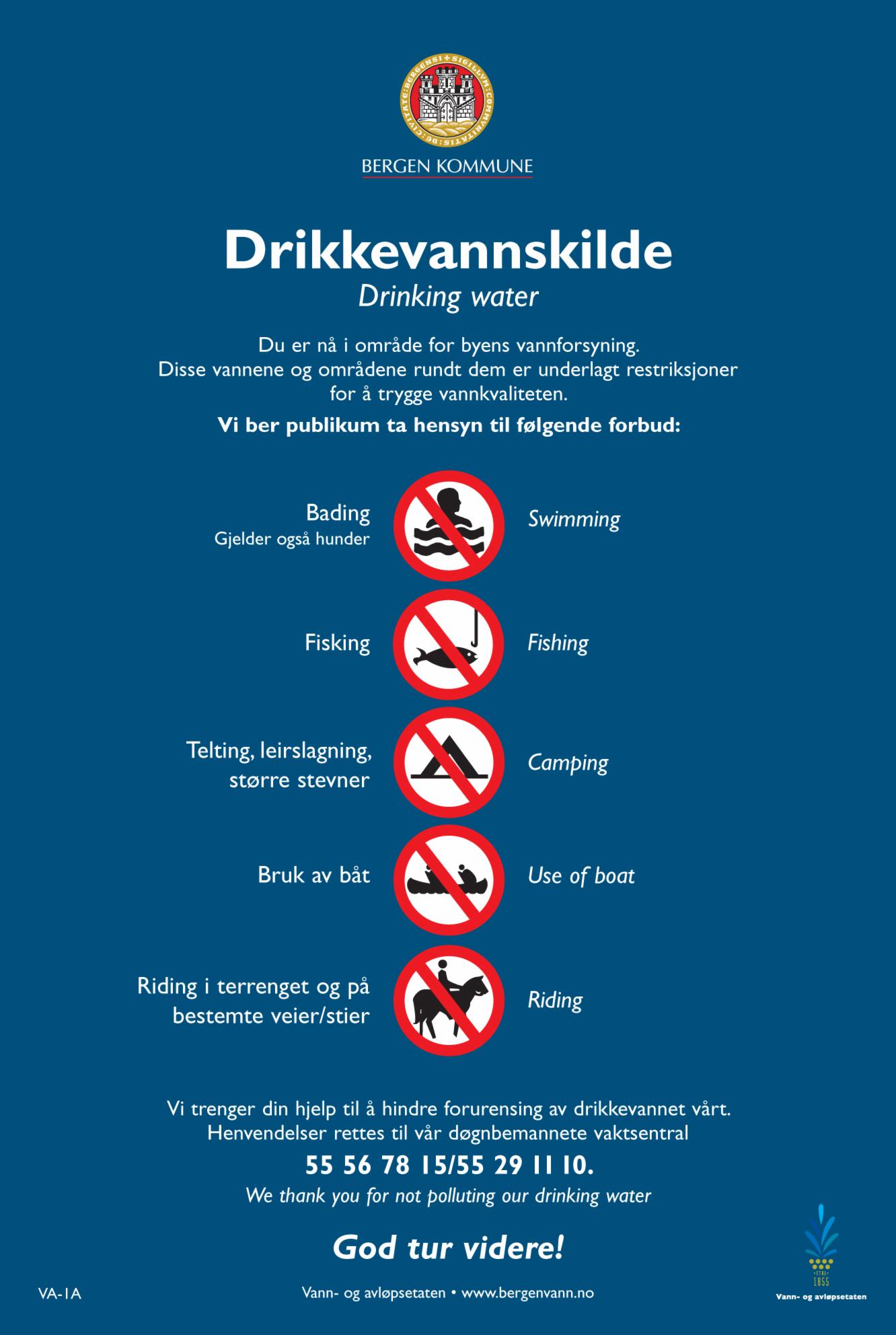 Ved hendelser og observasjoner i tilsigsfeltene og vannkildene vil vi gjerne at du melder ifra på feilmelding.bergen.kommune.no eller ringer vår døgnbemannede vaktsentral på telefon 55 56 78 15.