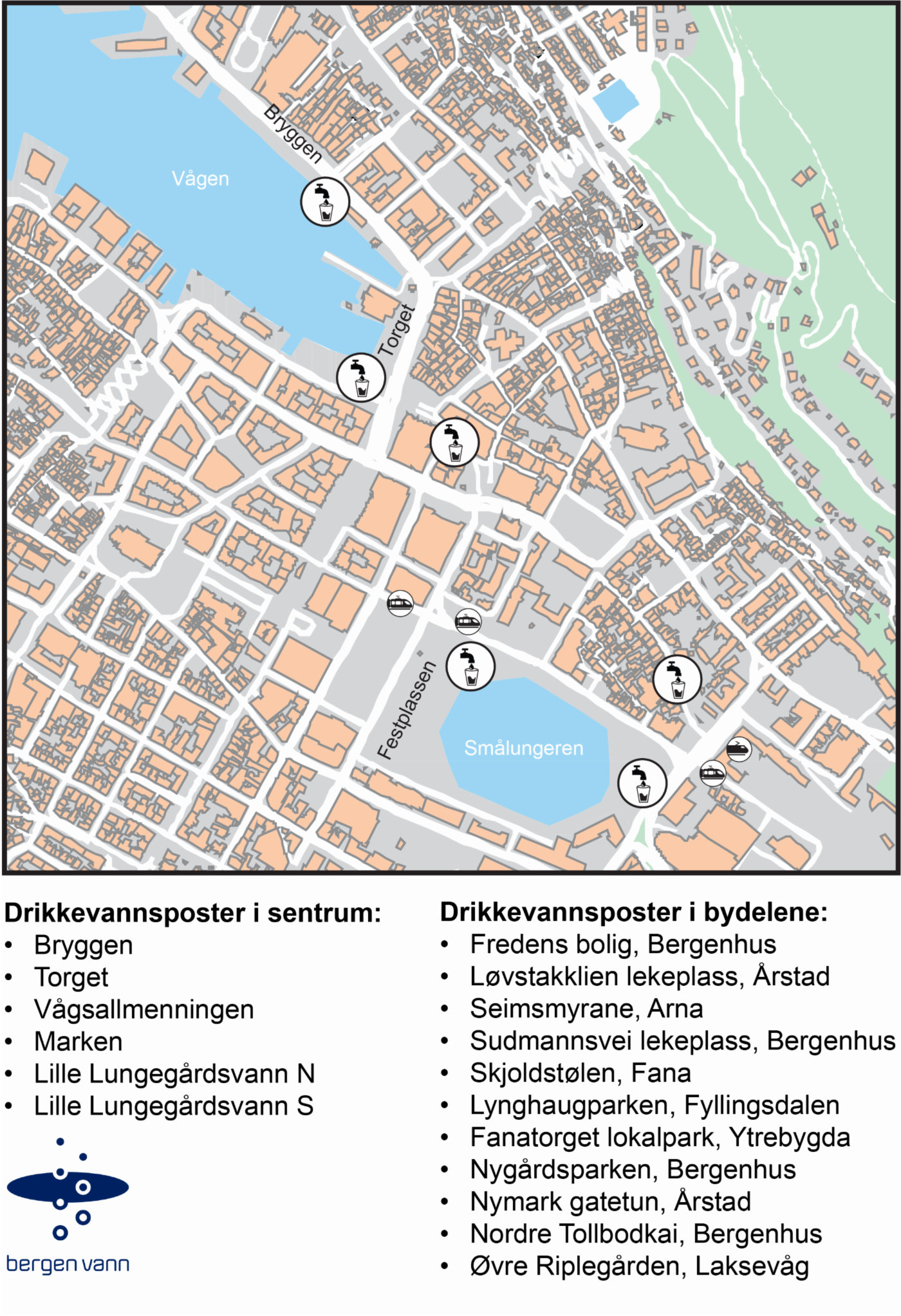 I sommerhalvåret plasserer vi ut drikkevannsposter på en rekke steder i sentrum og bydelene. Her kan man fylle drikkeflasken med frisk, rent og gratis bergensk drikkevann hele døgnet.