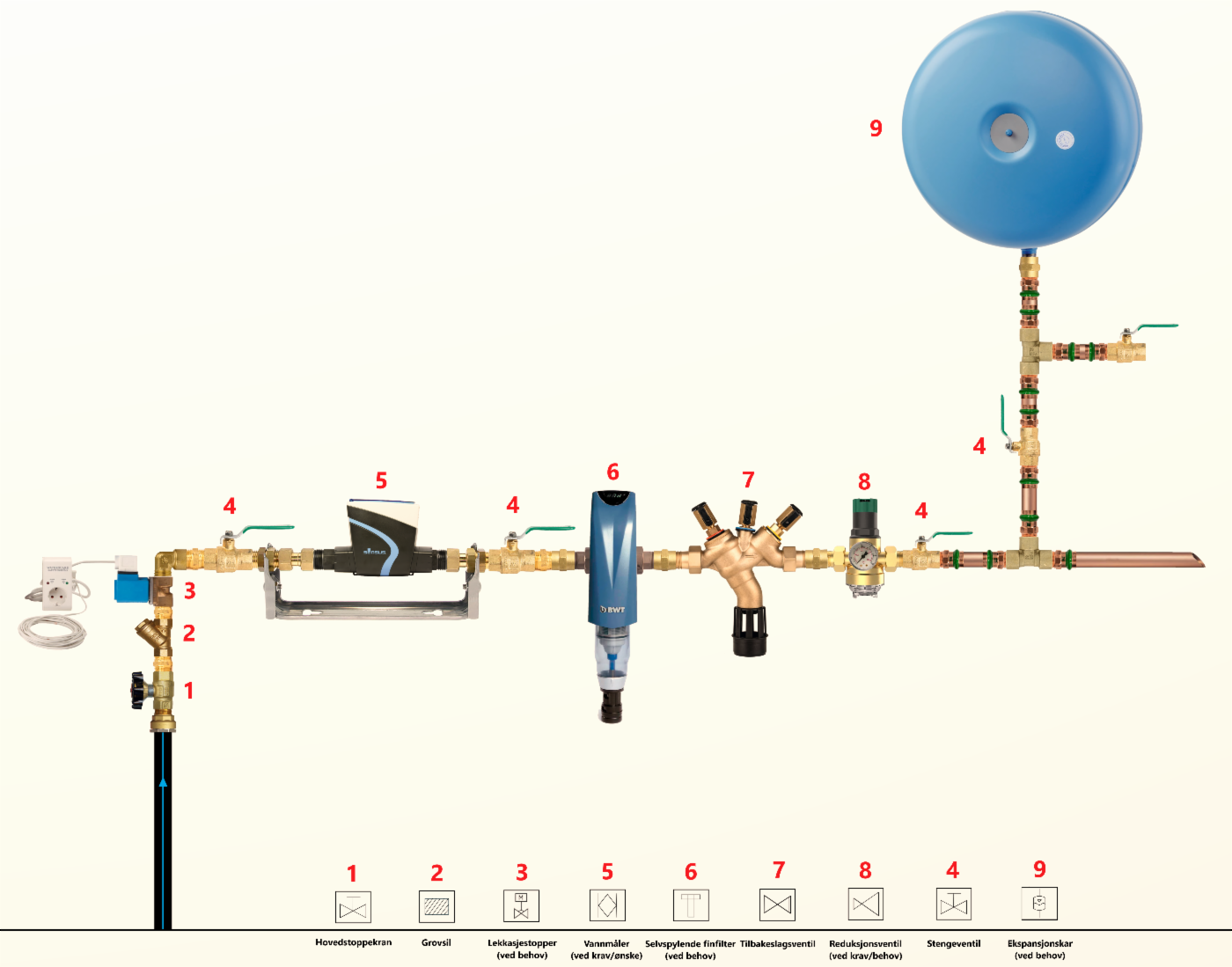 Her er ønsket rekkefølge på de ulike installasjonene, etter hovedstoppekranen. Valg av type installasjon vil variere ut fra bygg.