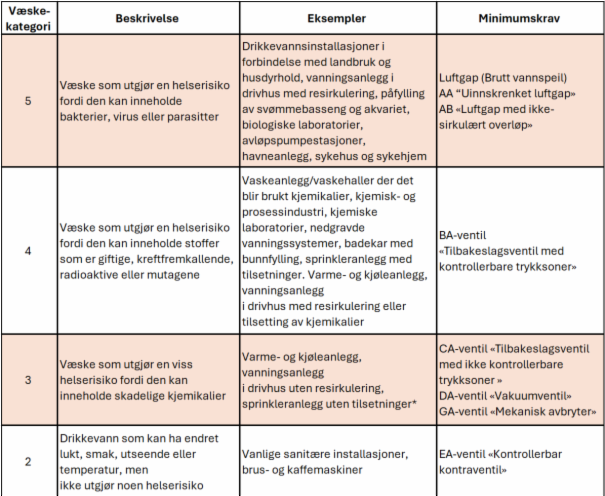 Vær oppmerksom på at Bergen Vann kan ha andre krav til væskekategori enn i veilederen til Norsk Vann.
