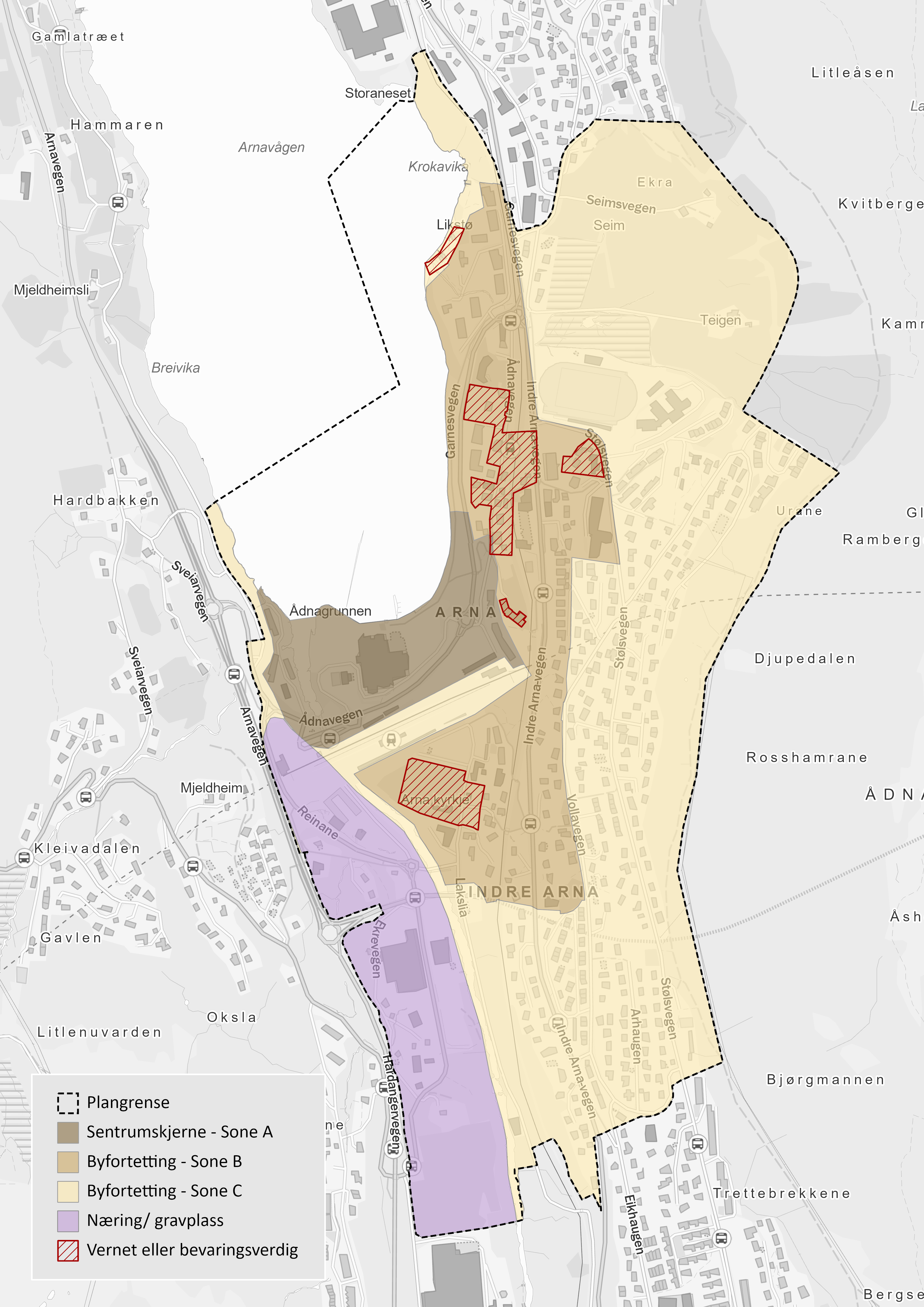 Planområdet omfatter de sentrale delene av Indre Arna, som er et av bydelssentrene i Bergen kommune. Indre Arna skal i kraft av å være bydelssenter bidra til å ta sin del av veksten i byutviklingen i årene fremover. Arna er et viktig kollektivknutepunkt både for jernbane og buss.