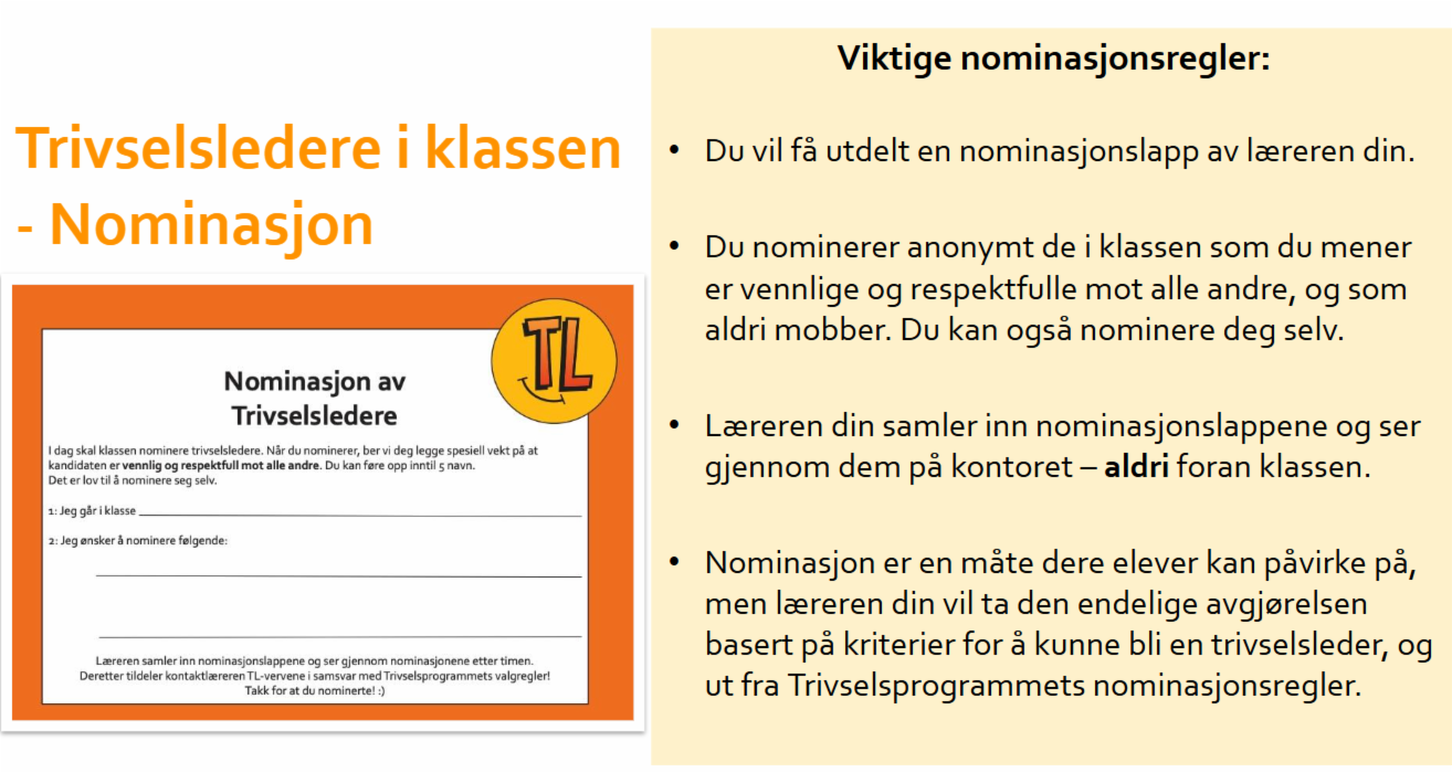 Alle som er inkluderende, vennlige og respektfulle mot alle andre kan bli TL. På Alvøen skole har vi trivselsledere fra 3.-7.trinn. Hvert halvår vil kontaktlærerne informere elevene om programmet, bl. a. hva som er målet med programmet, hva det betyr å være TL - og hva som er forventningene til til en trivselsleder. Trivselsleder i klassen velges gjennom anonym nominasjon eller søknad.