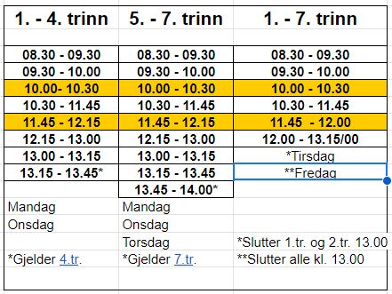 - 2., 3. og 4.trinn møter utenfor sitt klasserom til skolestart kl. 08.30 og slutter kl. 11.00. SFO er åpen fra kl. 11.00-16.30 for de som har SFO-plass.
