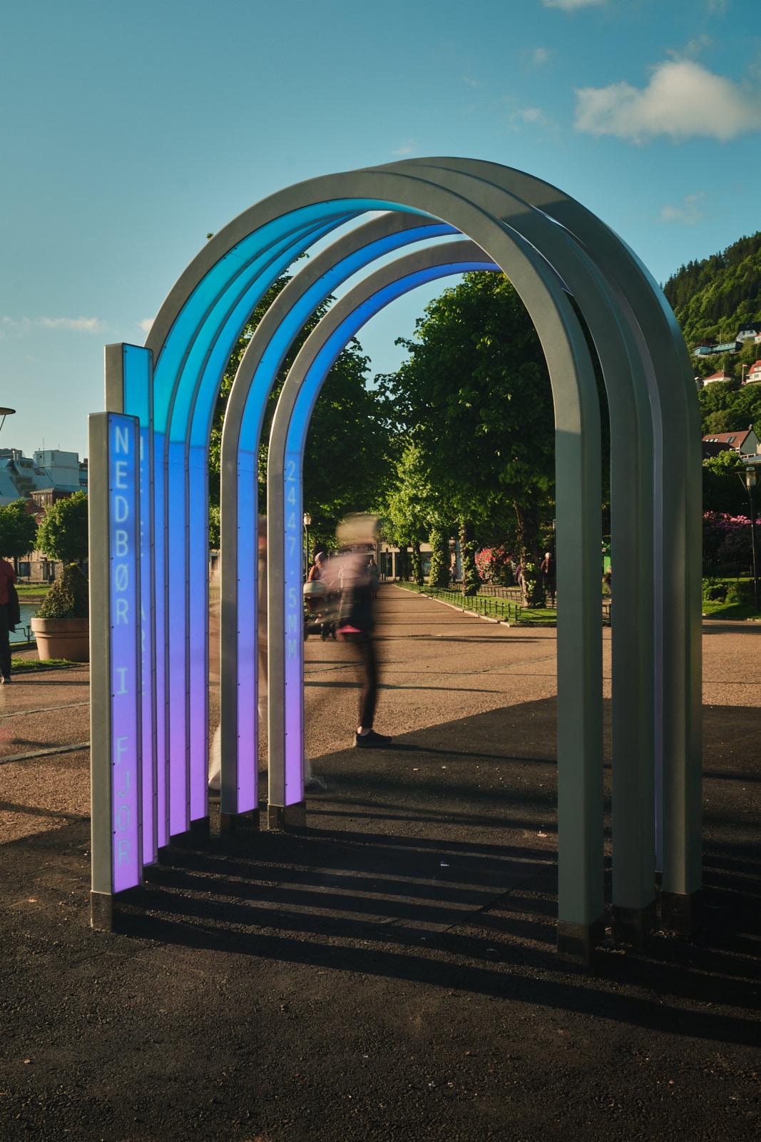 Installasjonen/Vannmåleren BYGE plassert i Byparken. Utsikt opp mot Fløyen