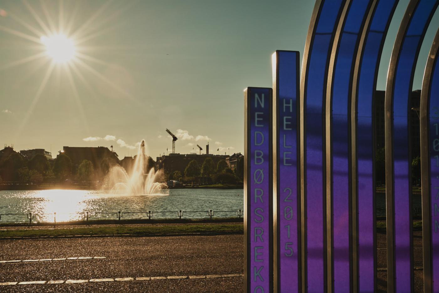 Installasjonen/nedbørsmåleren BYGE i kveldssol. Utsikt mot Lille Lungegårdsvann