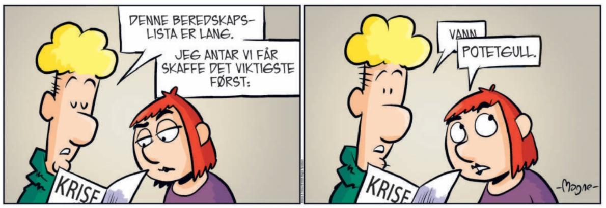 Vi er alle en del av Norges beredskap. Egenberedskap innebærer å ta «førstelinje-ansvaret» for egen tilværelse - at flest mulig er forberedt på å klare seg selv i en uke i en krisesituasjon. På den måten kan myndighetene prioritere innsats der det behøves mest. Det kan være hjelp til ekstra sårbare grupper, krisehåndtering eller gjenoppretting av infrastruktur som strøm, EKOM, veinett, vann og avløp.