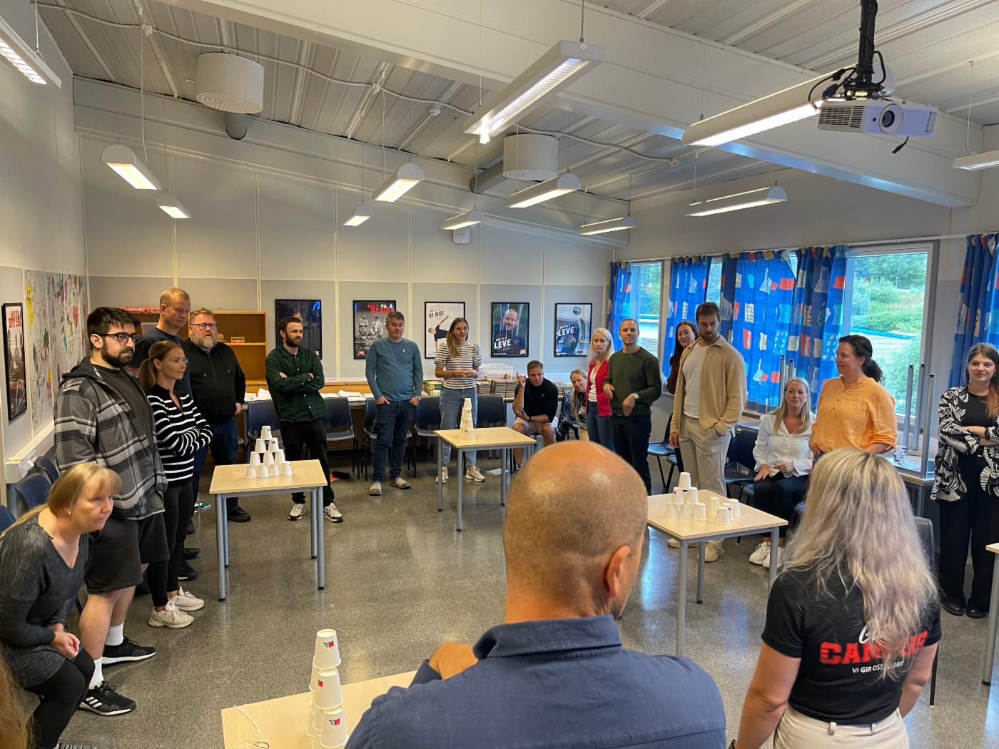 Alle trinnene møter i aula for felles oppstart, deretter går de klassevis og har noen bli-kjent-øvelser og en oppstartskartlegging.