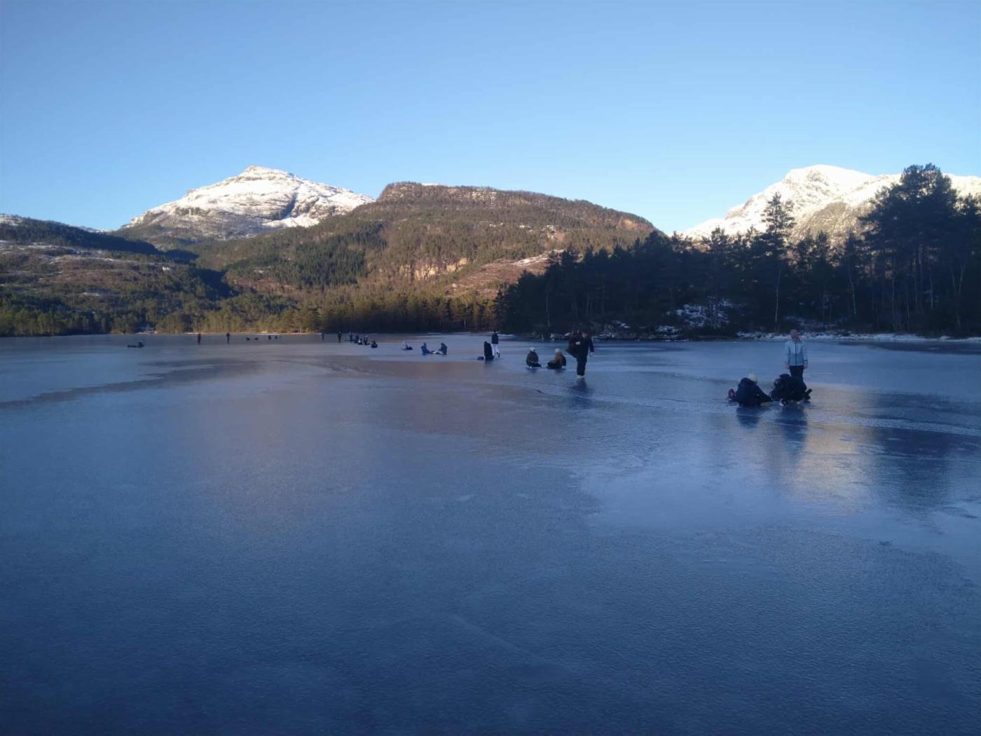 Vinteren har, omsider, stramma grepet kring Hålandsdalen. Me har, akkurat nok, snø til å gå på ski og truger samstundes som me har trygg is på vatna me nyttar med elevar på leirskule.