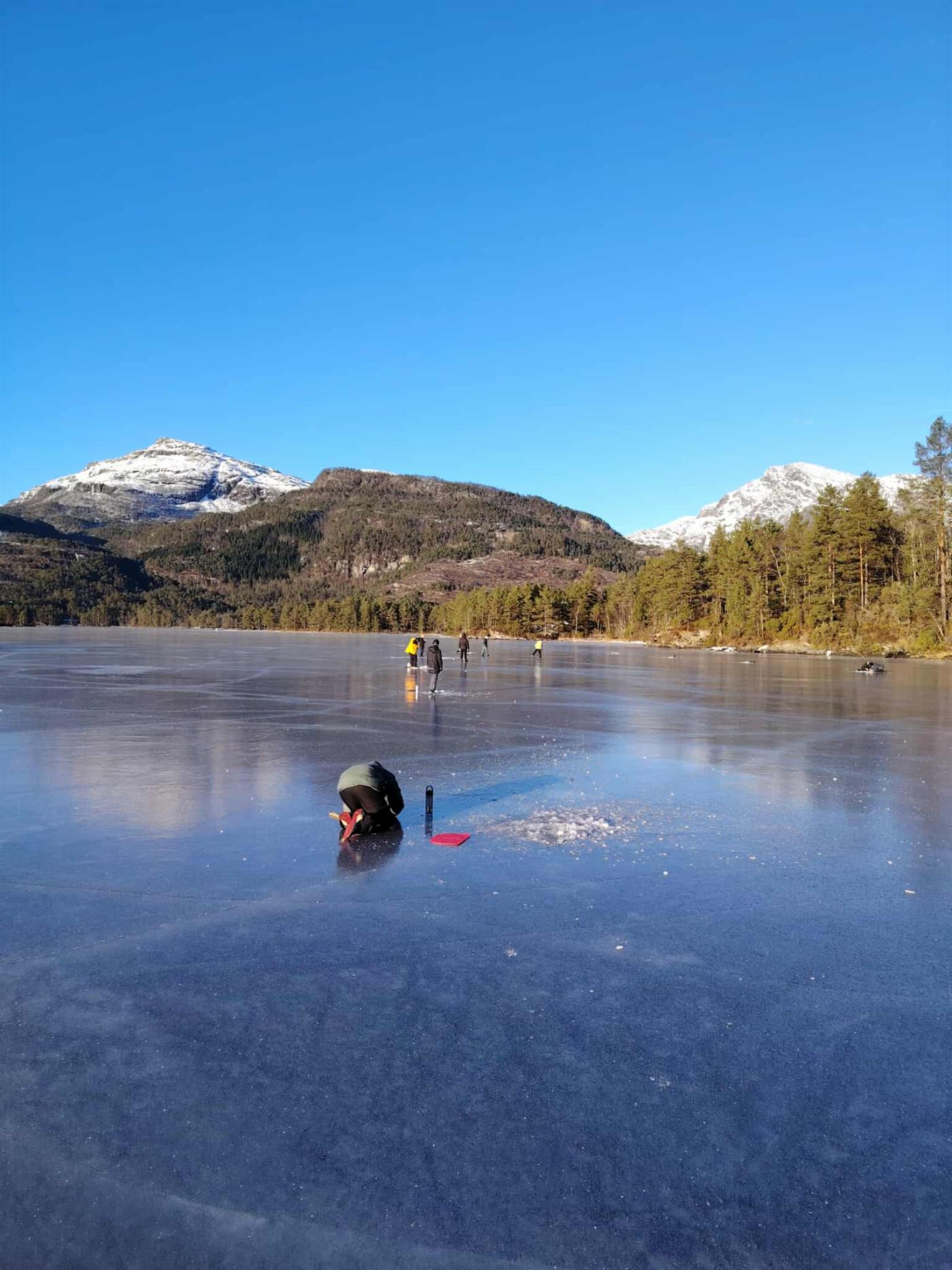 Dette er noko av det som elevane har fått høyre om på deira ferd innover isen på Gjønavatnet. Det er lenge mellom kvar gong dette er mogleg å gjere – så då sjansen no baud seg, med trygg is og fantastiske skøyteforhold, ja då var det berre å rigge turdag på skøyter til Kikedalen.