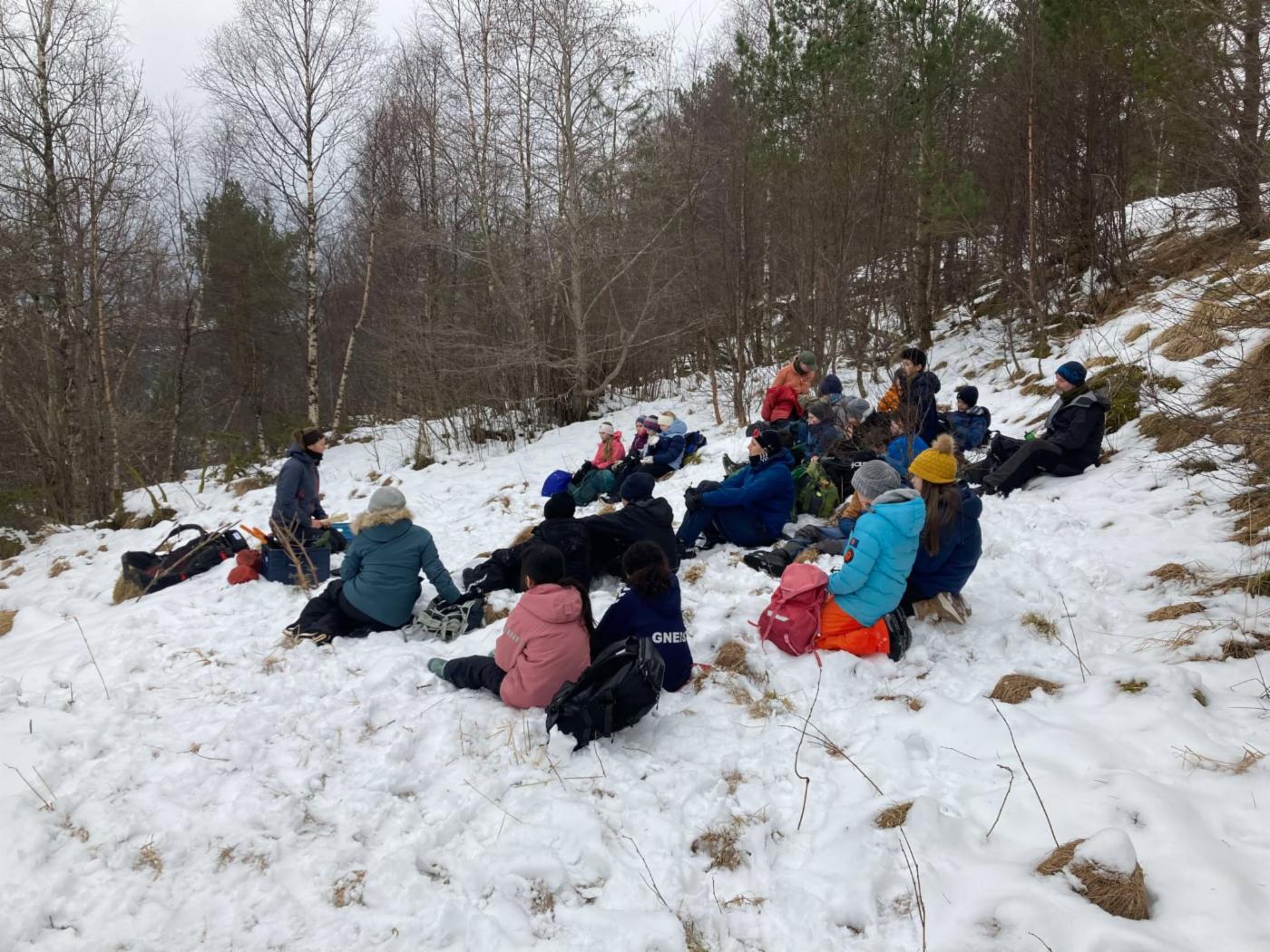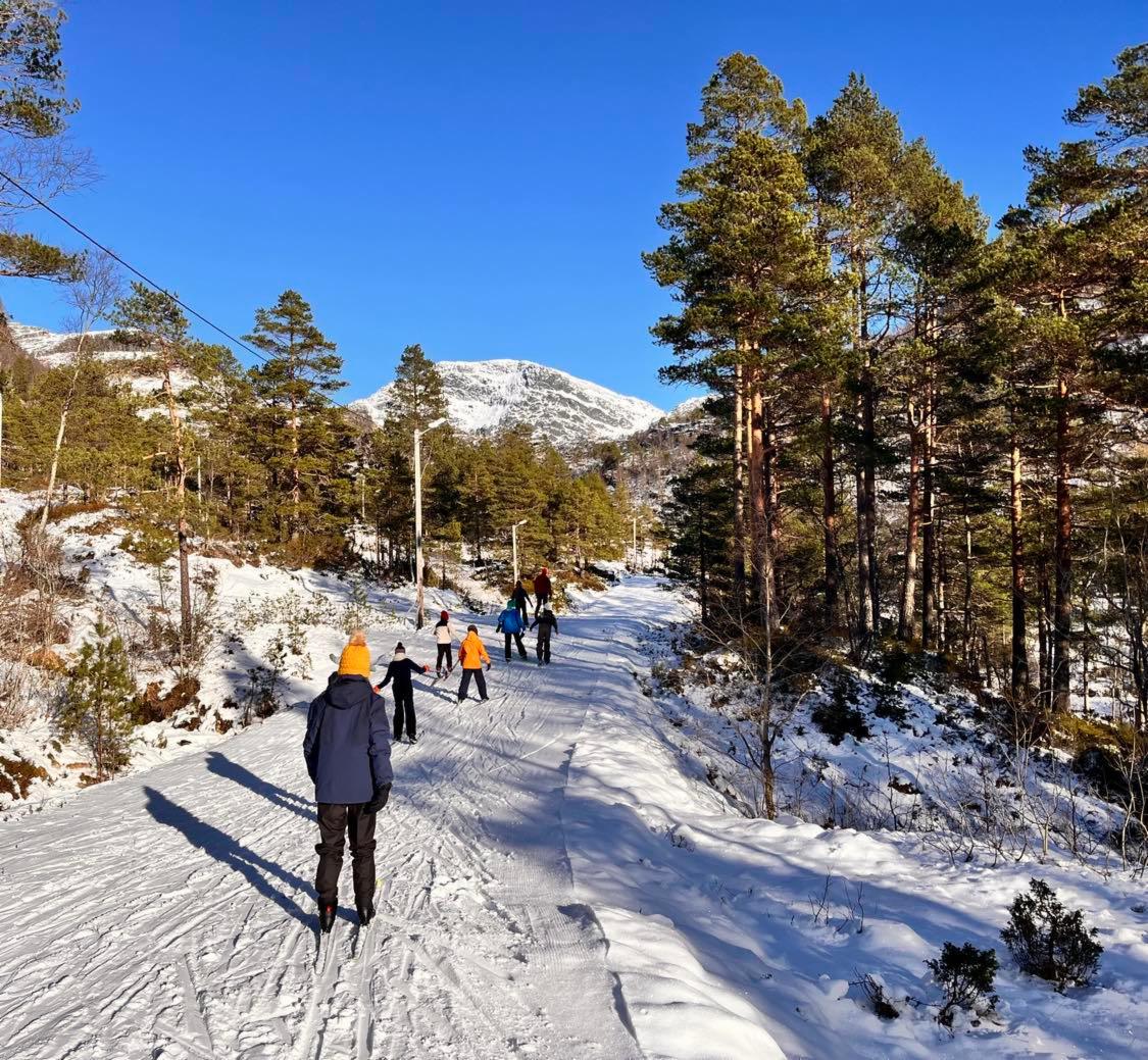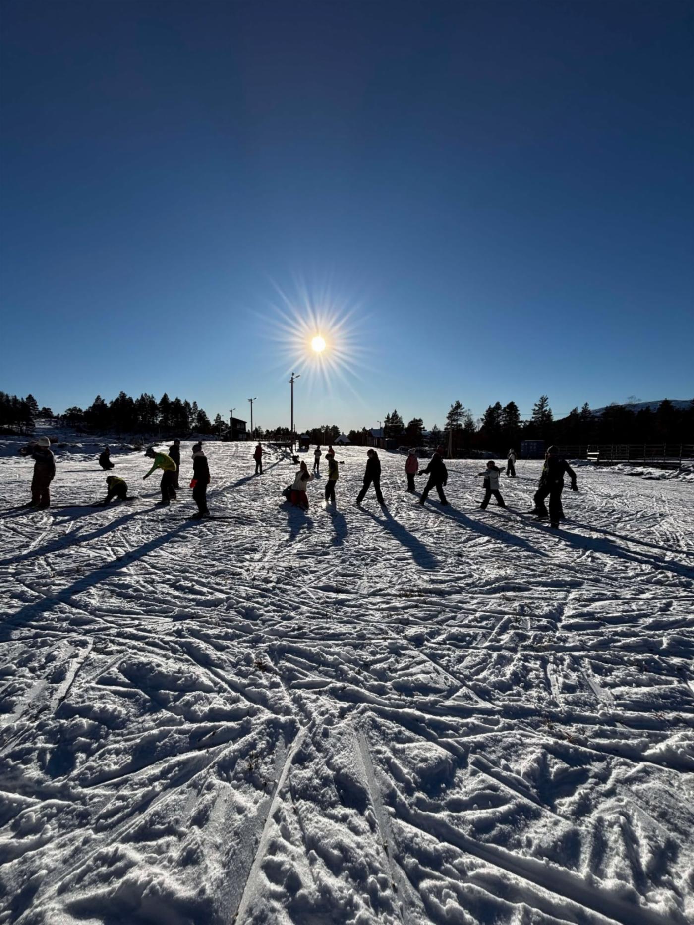 Etter velkomstdag måndag med innføring i leirskulelivet, vêrmeldingstime og samarbeidsaktivitetar var det tysdag duka for ein heil dag på ski i løypene til fjells. Forkunnskapen til elevane i skigåing er svært varierande - for nokre er det første gong ein har ski på beina, medan andre er veldig erfarne. Likevel er ei økt med grunnleggande skiopplæring for alle noko av det første me gjer ein skidag. Ein gjennomgang av ulike måtar å skifta retning med ski på beina, korleis komma seg opp igjen på beina etter eit fall og ulike måtar å bevega seg på med ski er ei økt som kan vera både nyttig og gøy uansett erfaringsbakgrunn. Etter denne økta var me klar for lunsj med felles bål, niste og varm drikke. Med påfyll av energi var me klar for nok ei skiøkt etter lunsj der elevane var innom ulike stasjonar med ulike skiaktivitetar der alt frå “stiv heks” til skistafett og køyring i rekke var aktivitetar.