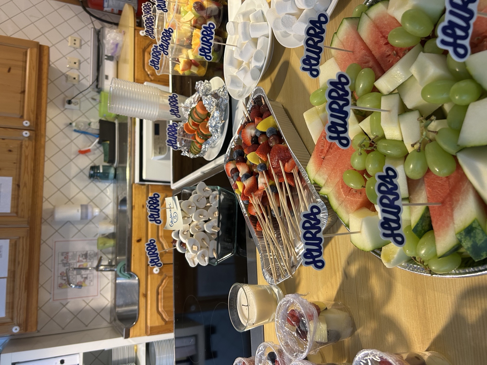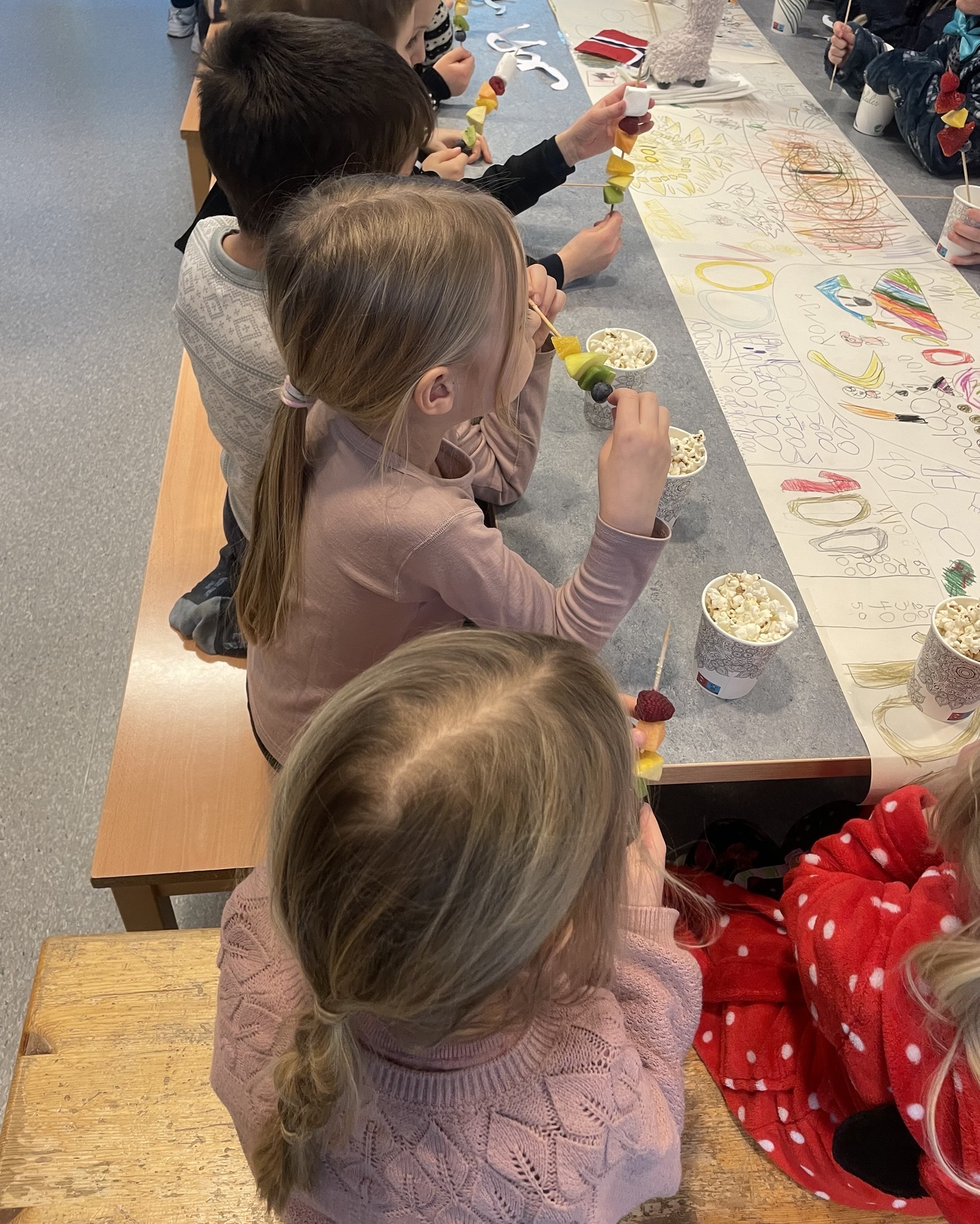 Det ble dekket langbord og servert fruktspyd, popcorn og saft.