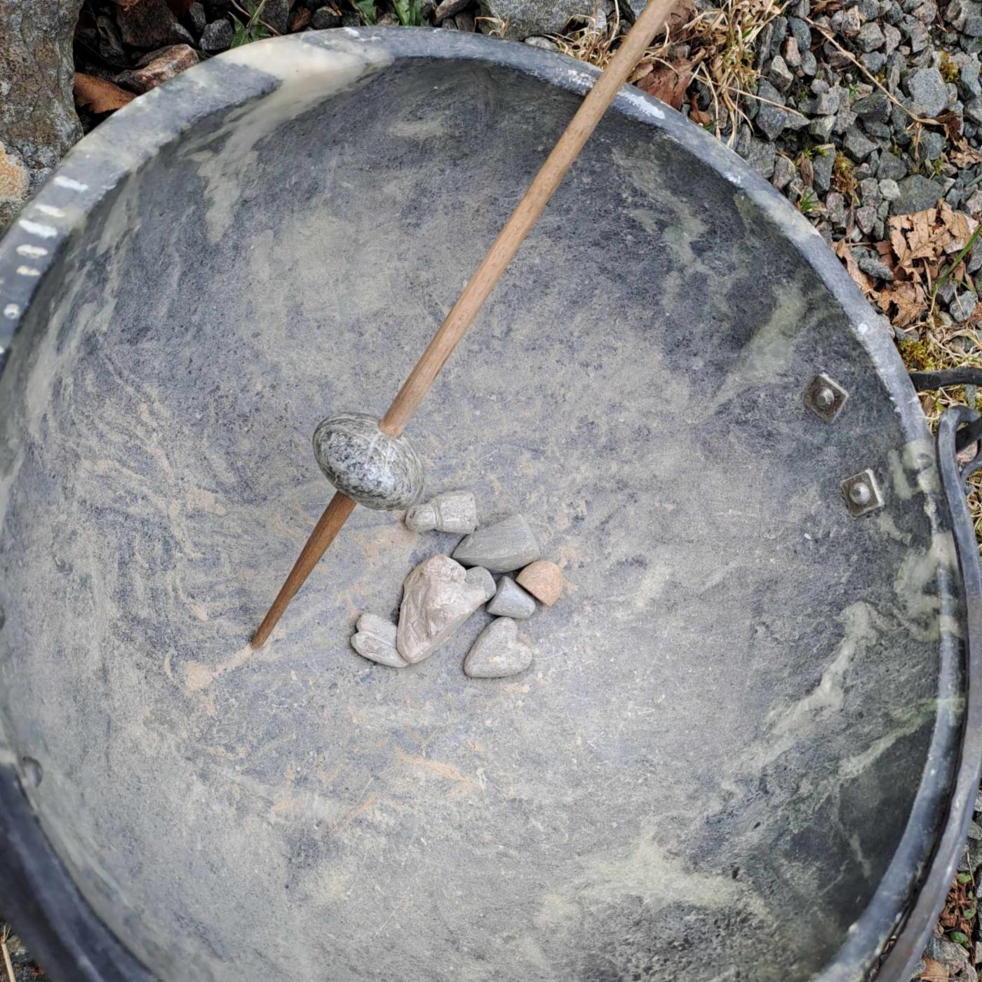Gryte i kleberstein og andre gjenstander formet i kleberstein.