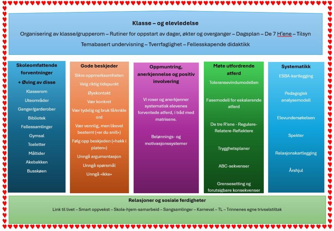 I personalet jobber vi kontinuerlig med å utvikle gode relasjoner mellom de voksne og barna, da dette er selve bærebjelken i et godt skolemiljø. På illustrasjonen under ser dere også en del av de andre kjernekomponentene i PALS-modellen. Vi bruker også mye tid på oppmuntring, støtte og på å anerkjenne positiv atferd.
