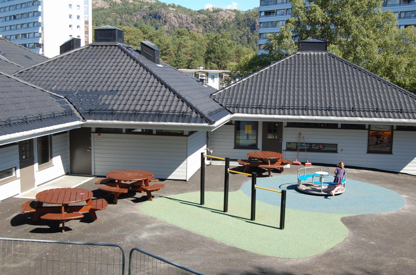 - Barnehagen ligger i flotte omgivelser med skog både innenfor og utenfor gjerdet .