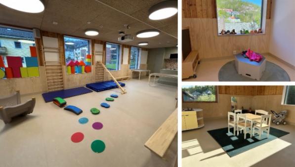 Barnehagen er organisert i fire hjemområder. Hjemområdene Rød og Grønn er for barna mellom 0-3 år. Hjemområdene Gul og Blå er for barna 3-6 år. Barnehagen har seks ulike, helt nye temarom, der barna kan få variert lek på tvers av både alder og hjemområde Vi har blant annet et sanserom, og et grovmotorisk rom. Det flott uteområdet vårt innbyr til variert lek, med småkupert terreng og lekeapparater som gir barna ulike utfordringer.