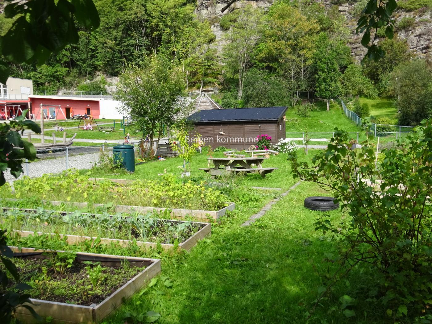 Inne i barnehagen finnes ulike aktivitetsrom som amfi til fellesarrangement, bibliotek og rom for motorisk aktivitet. Ute har vi snekkerbod, veksthus og bål hus. Uteområde er et stort og oversiktlig leke areal i front av barnehagen. Vi benytter oss også av nærområdets fine turmål som blant annet; Hellen festning, Munkebotn og Sandviksfjellet.