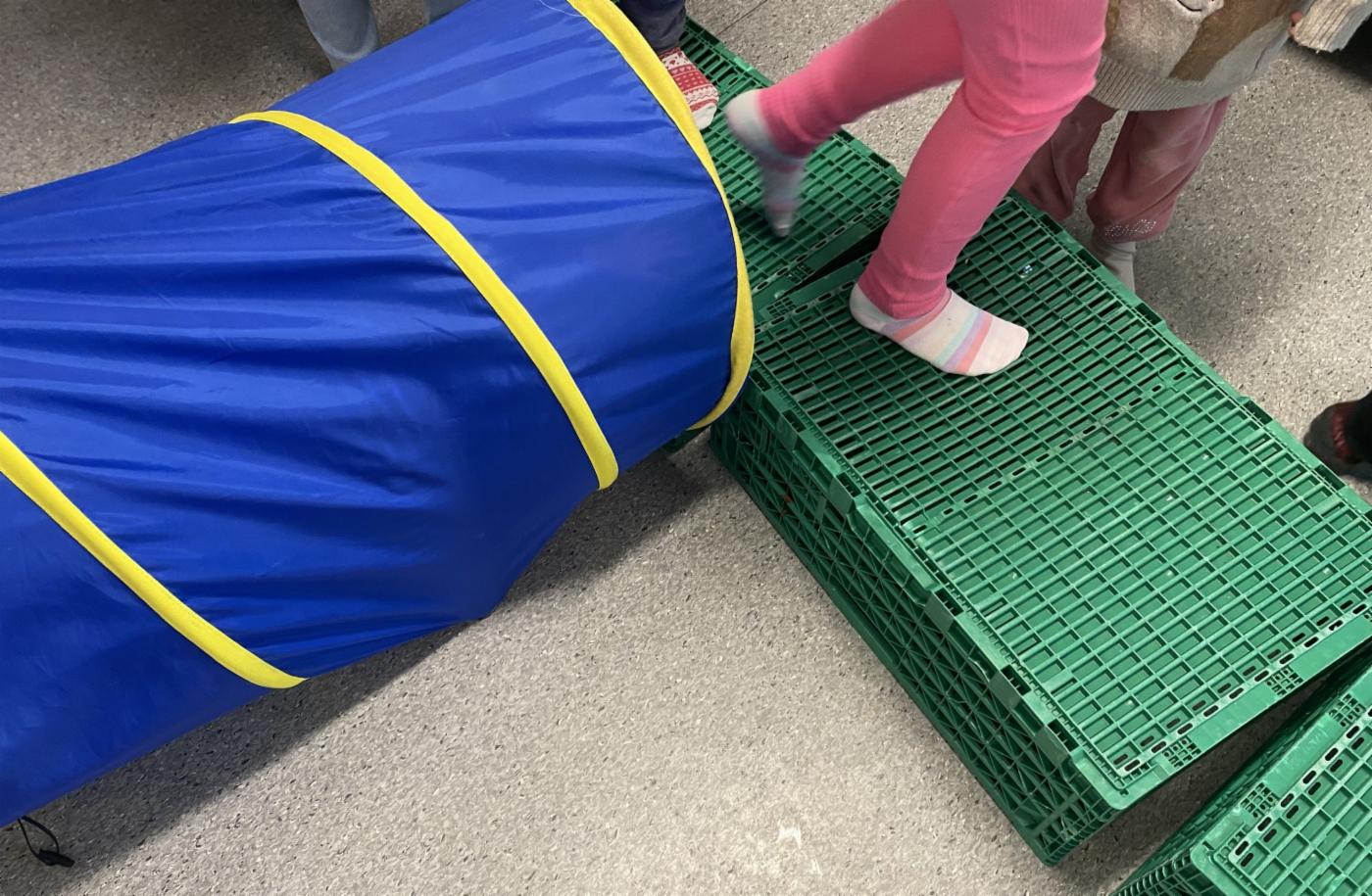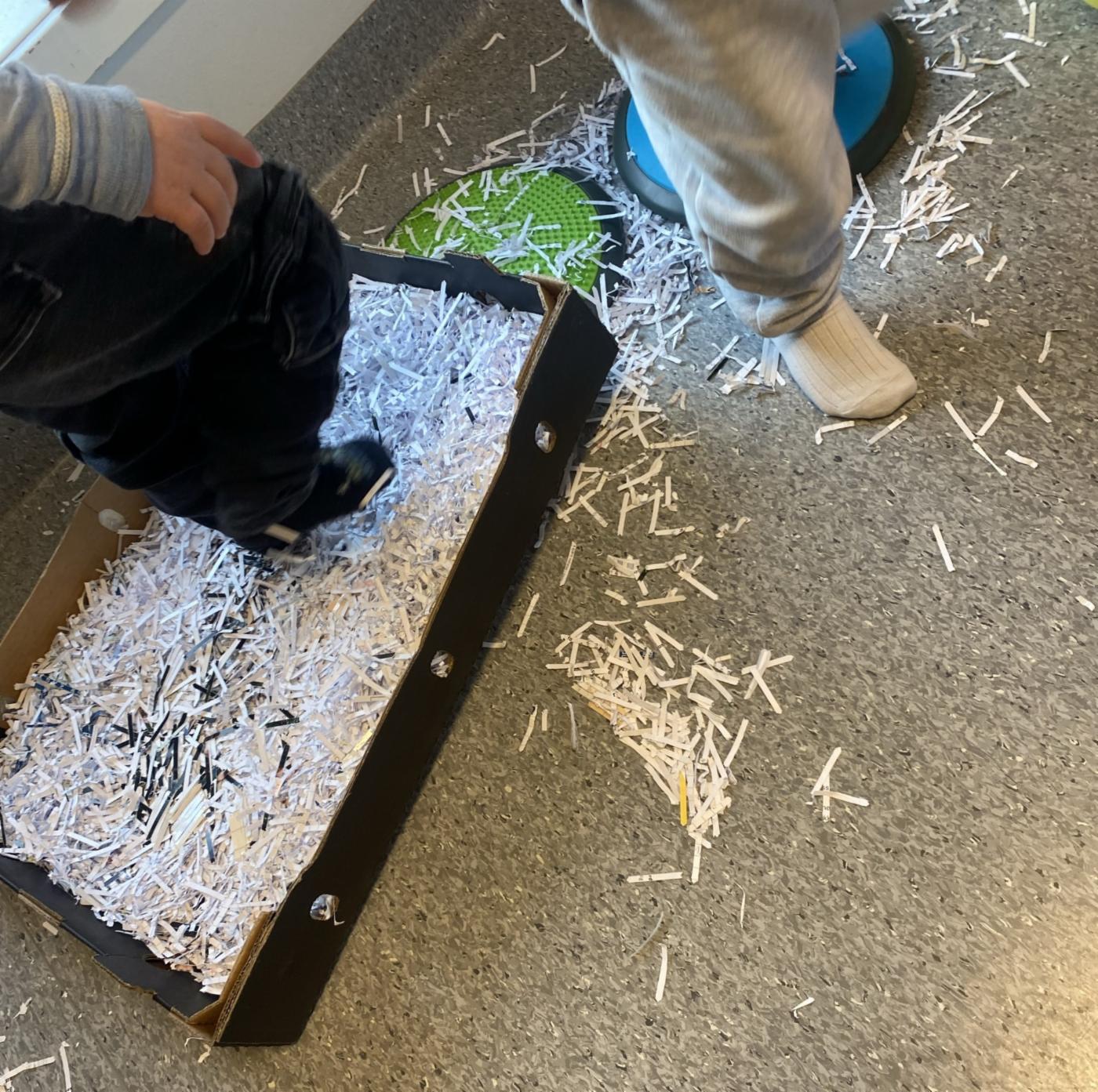 På det ene lillerommet var det laget i stand en liten sanseløype. Du kan tro det var spennende med papir som etter hvert var over hele rommet. “Vi tok papiret oppi boksen og snudde den oppihodet!” var det en som fortalte. En annen fortalte at det gøyeste var å kunne gå rundt i hele barnehagen på jakt etter ting å gjøre.
